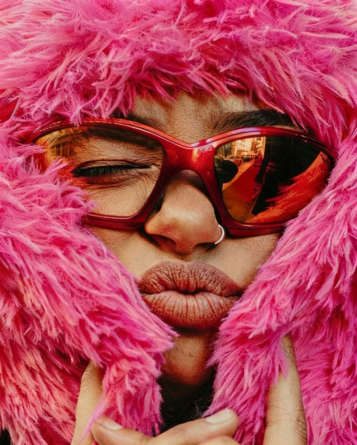 Close-up of a person in a pink furry hat and red sunglasses, puckering their lips playfully. Vibrant and fun fashion moment.