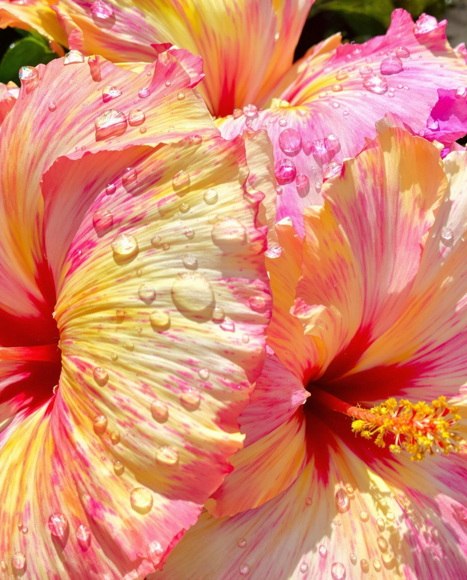 Close-up of a colorful hibiscus flower with pink, yellow, and white petals, covered in water droplets for a fresh, vibrant look.