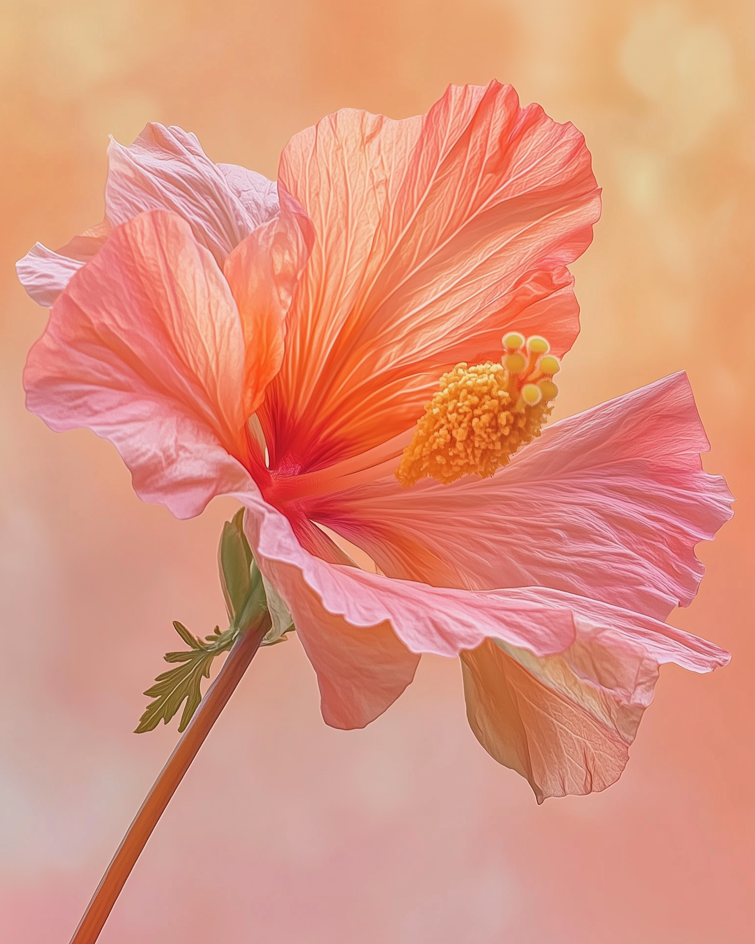 Close-up of a vibrant pink and orange hibiscus flower with a prominent yellow stamen against a soft peach background.