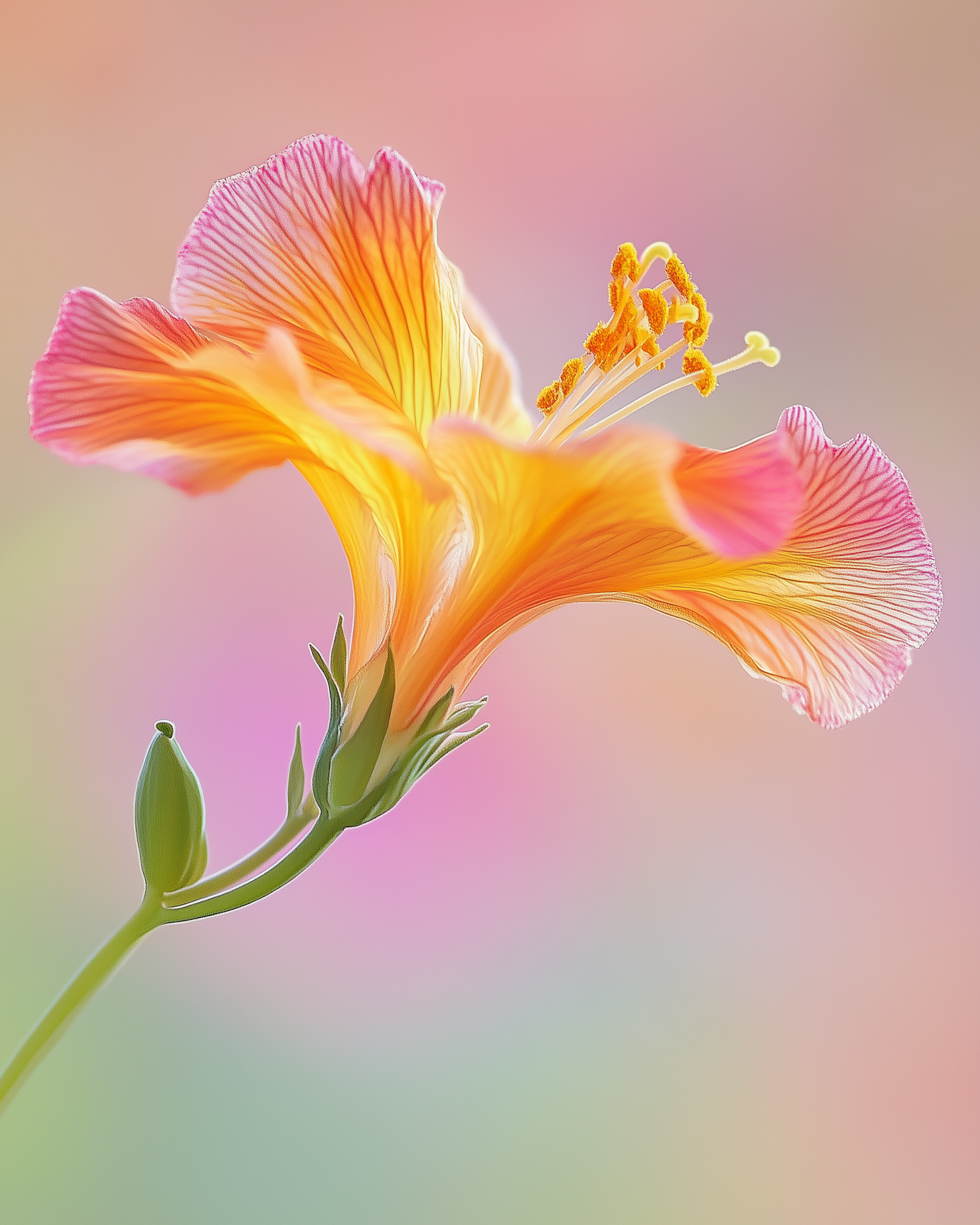 Close-up of a vibrant hibiscus flower with orange, pink, and yellow petals against a soft pastel background.