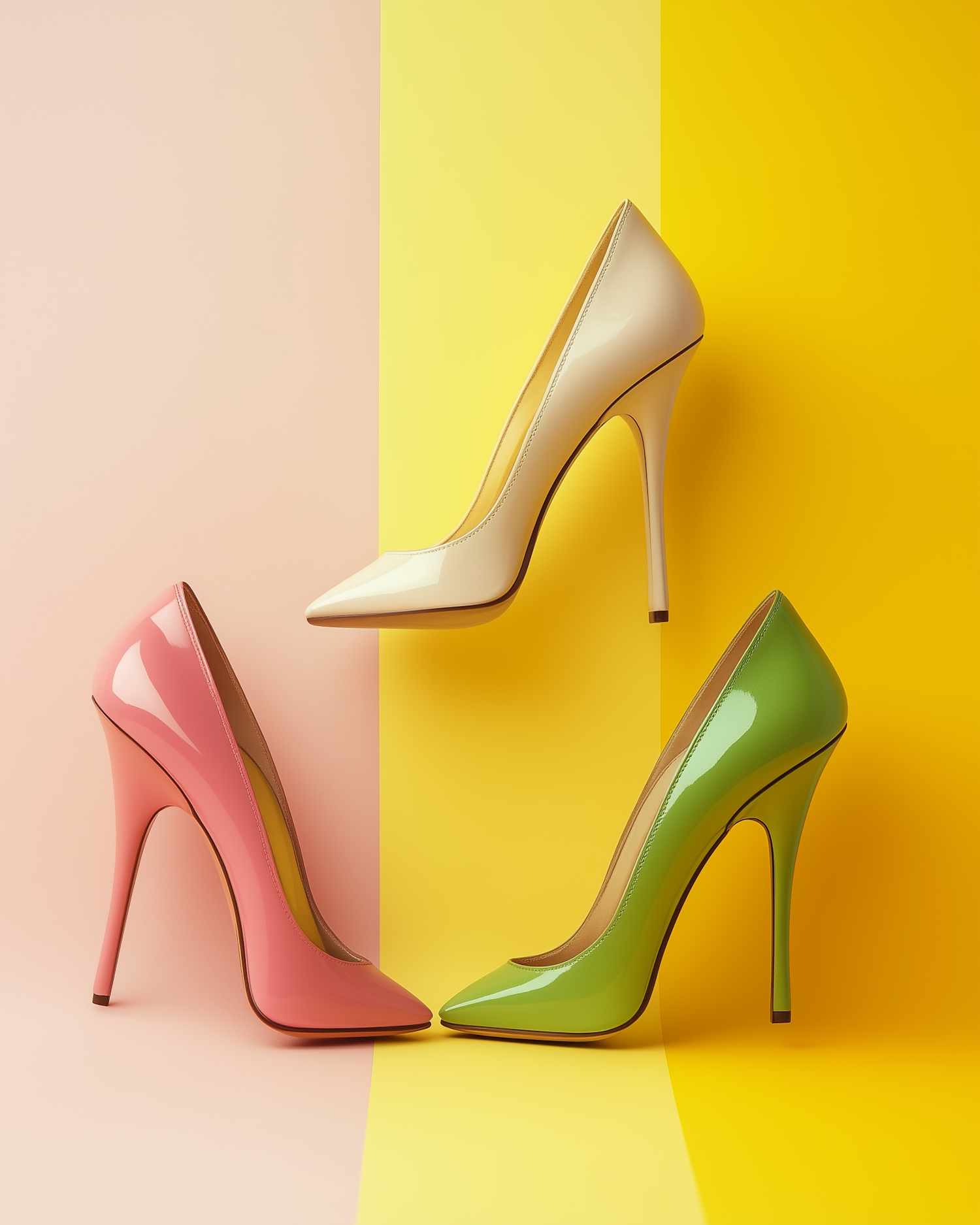Stylish high-heeled shoes in cream, pink, and green against a vibrant pink and yellow background. Modern and elegant design.