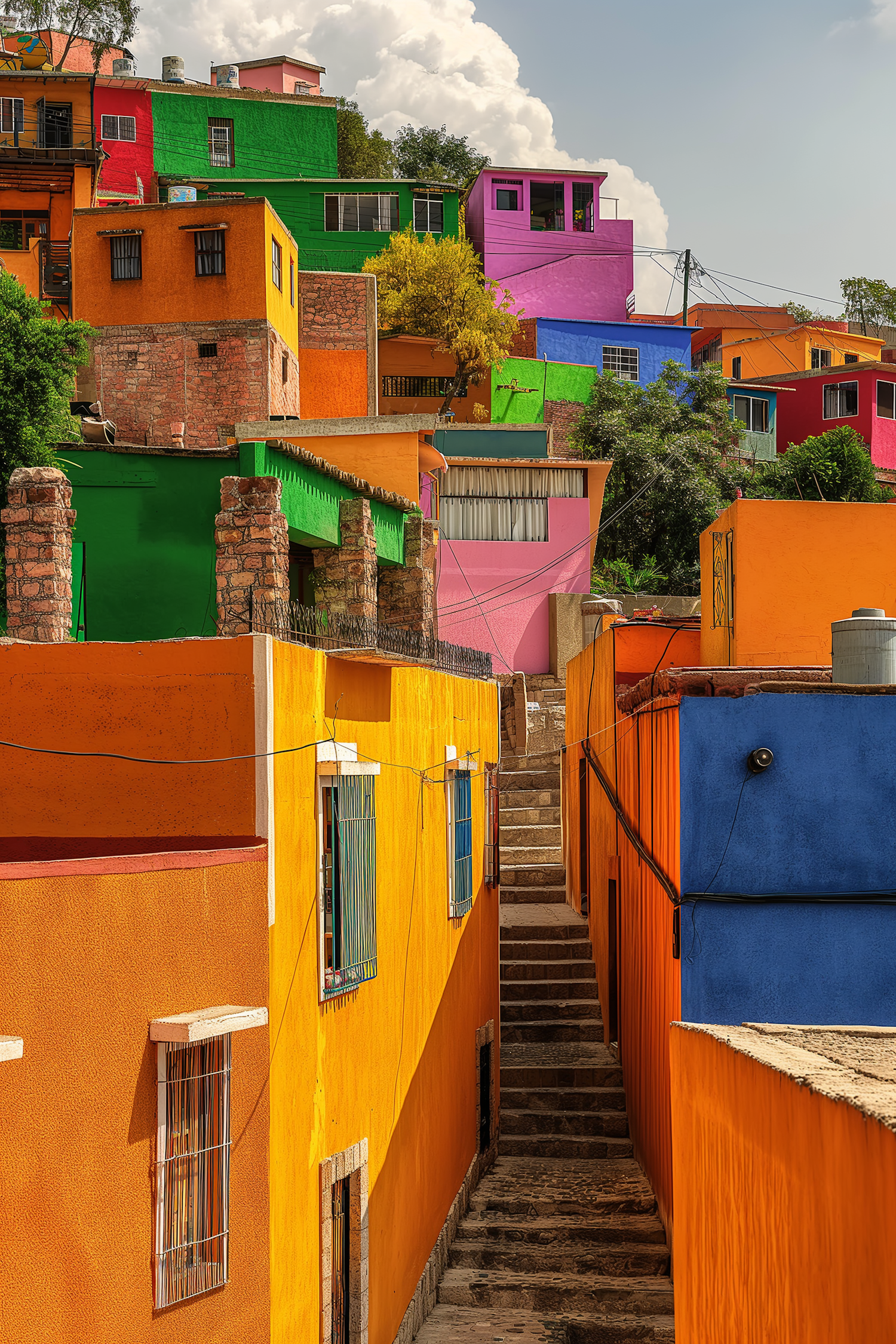 Colorful hillside neighborhood with vibrant houses and narrow stone stairway under a partly cloudy sky.