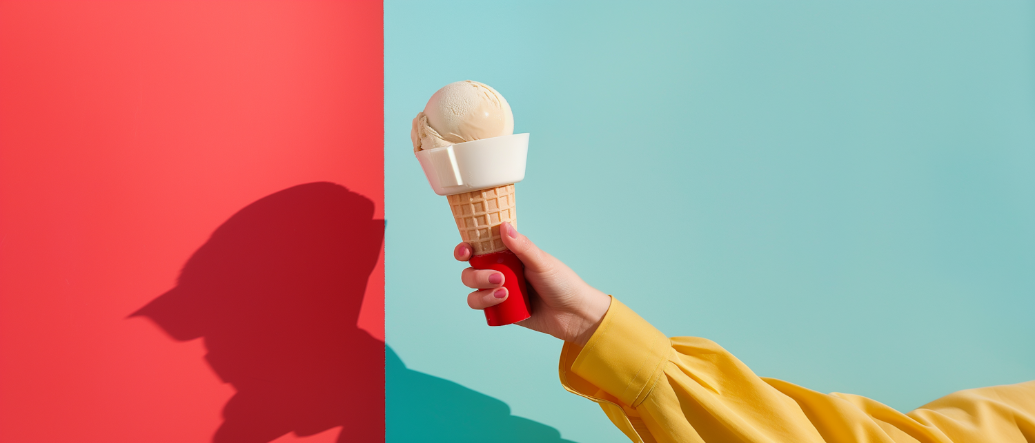Hand holding an ice cream cone with a colorful red and turquoise background, casting a shadow. Bright and vibrant composition.