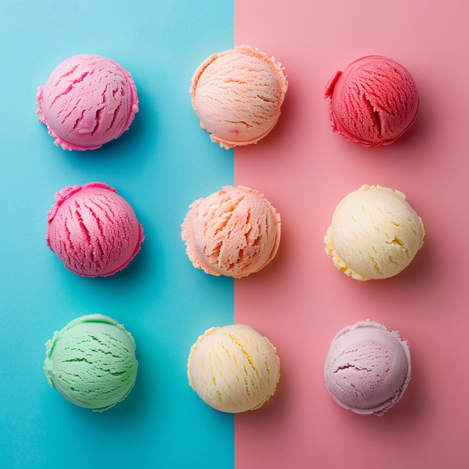 Colorful ice cream scoops on a split blue and pink background, showcasing a variety of flavors in a playful arrangement.