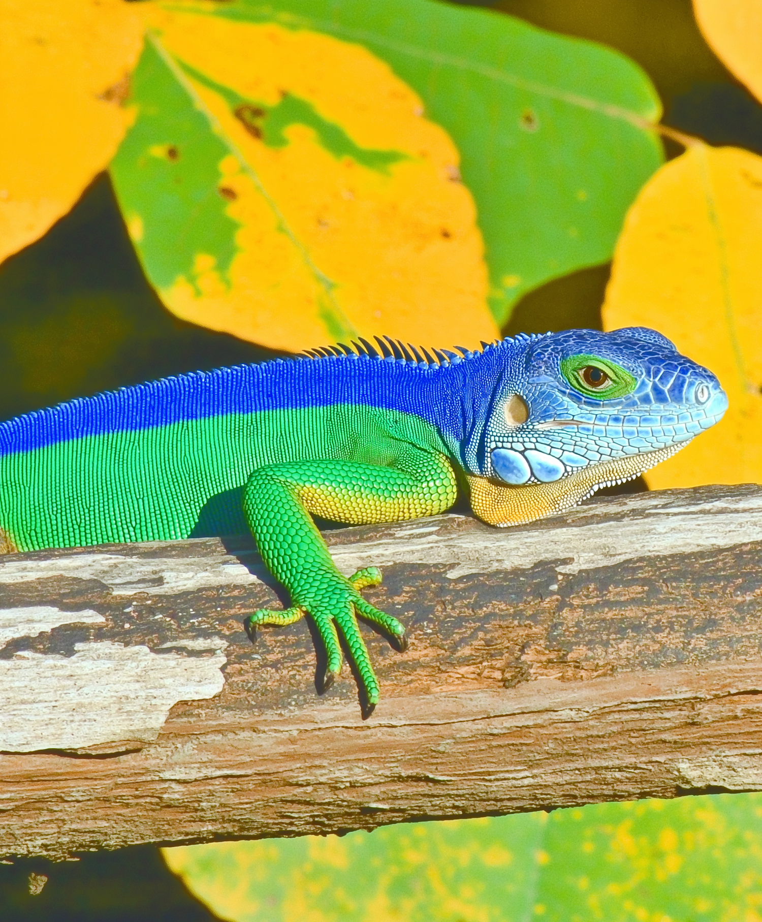 Colorful iguana with blue and green scales on a branch, surrounded by green and yellow leaves in a tropical setting.