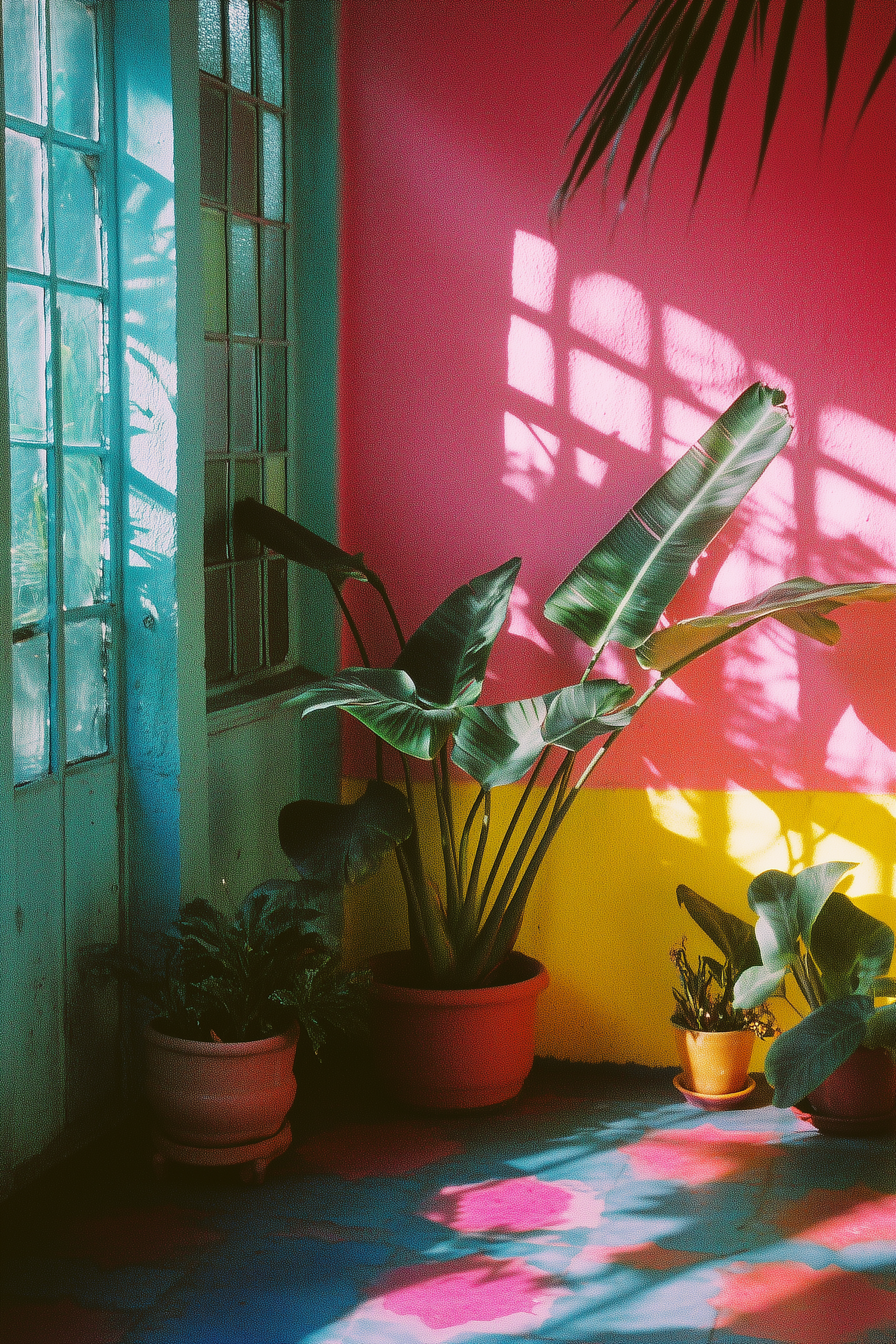 Vibrant indoor scene with colorful walls, large green plants, and sunlight casting geometric shadows through a window.