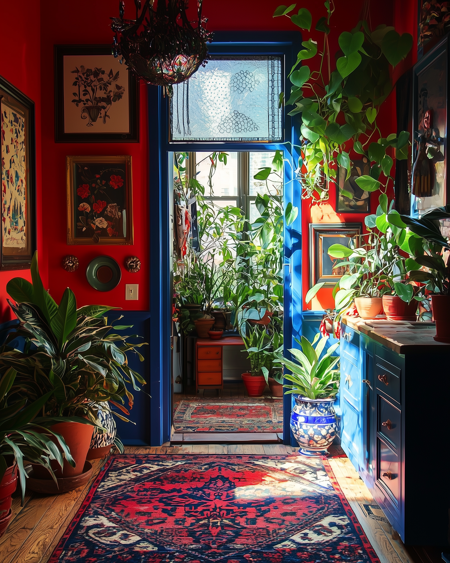 Eclectic room with red walls, blue accents, lush plants, Persian rug, and artistic decor. A cozy, vibrant indoor garden vibe.