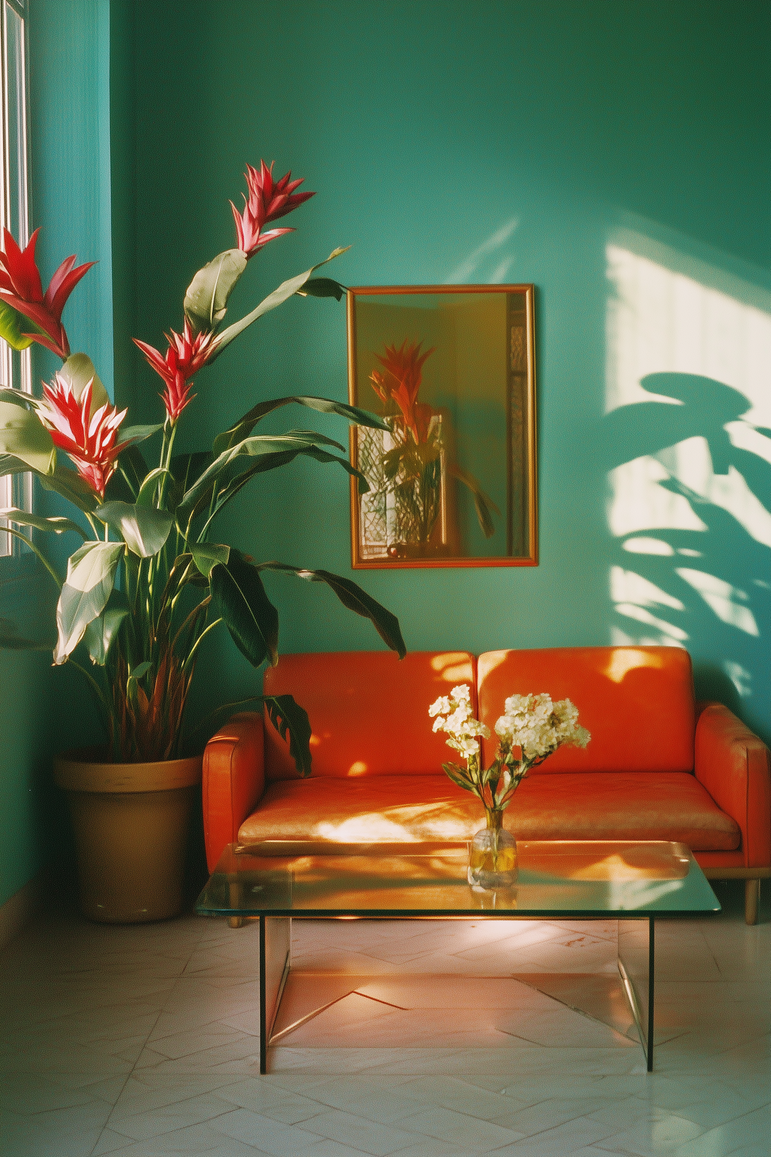 Vibrant living room with teal walls, orange sofa, and lush plant. Sunlight casts warm shadows, enhancing the cozy ambiance.