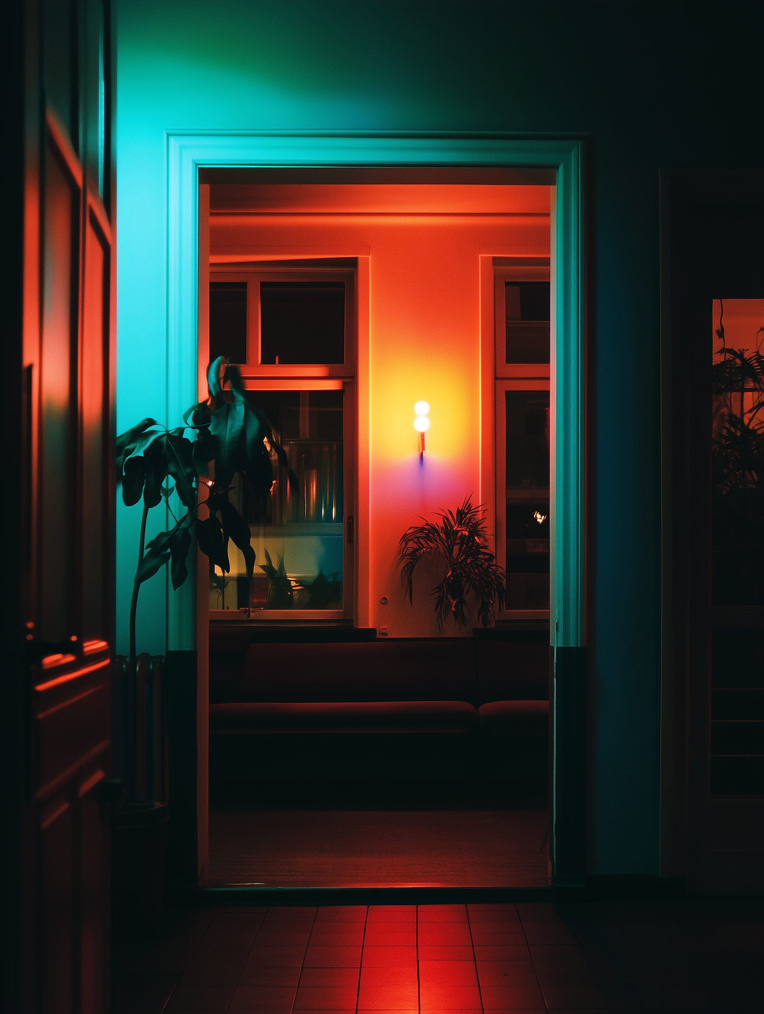 A doorway glows with teal and red light, leading to a cozy room with warm orange hues, plants, and a modern wall sconce.