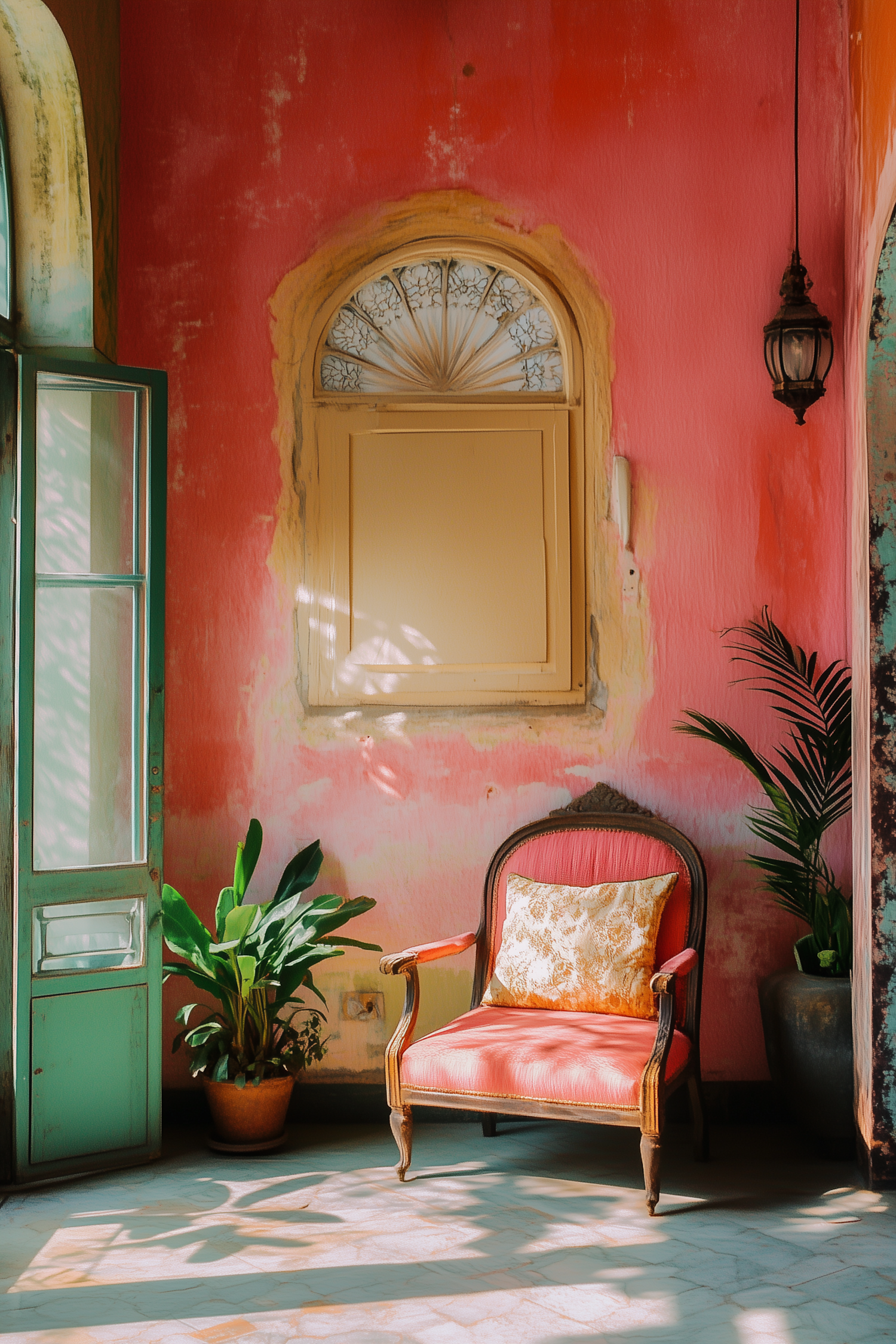 Cozy room with pink walls, vintage armchair, and lush plants. Sunlight streams through a teal door, creating a warm, inviting atmosphere.