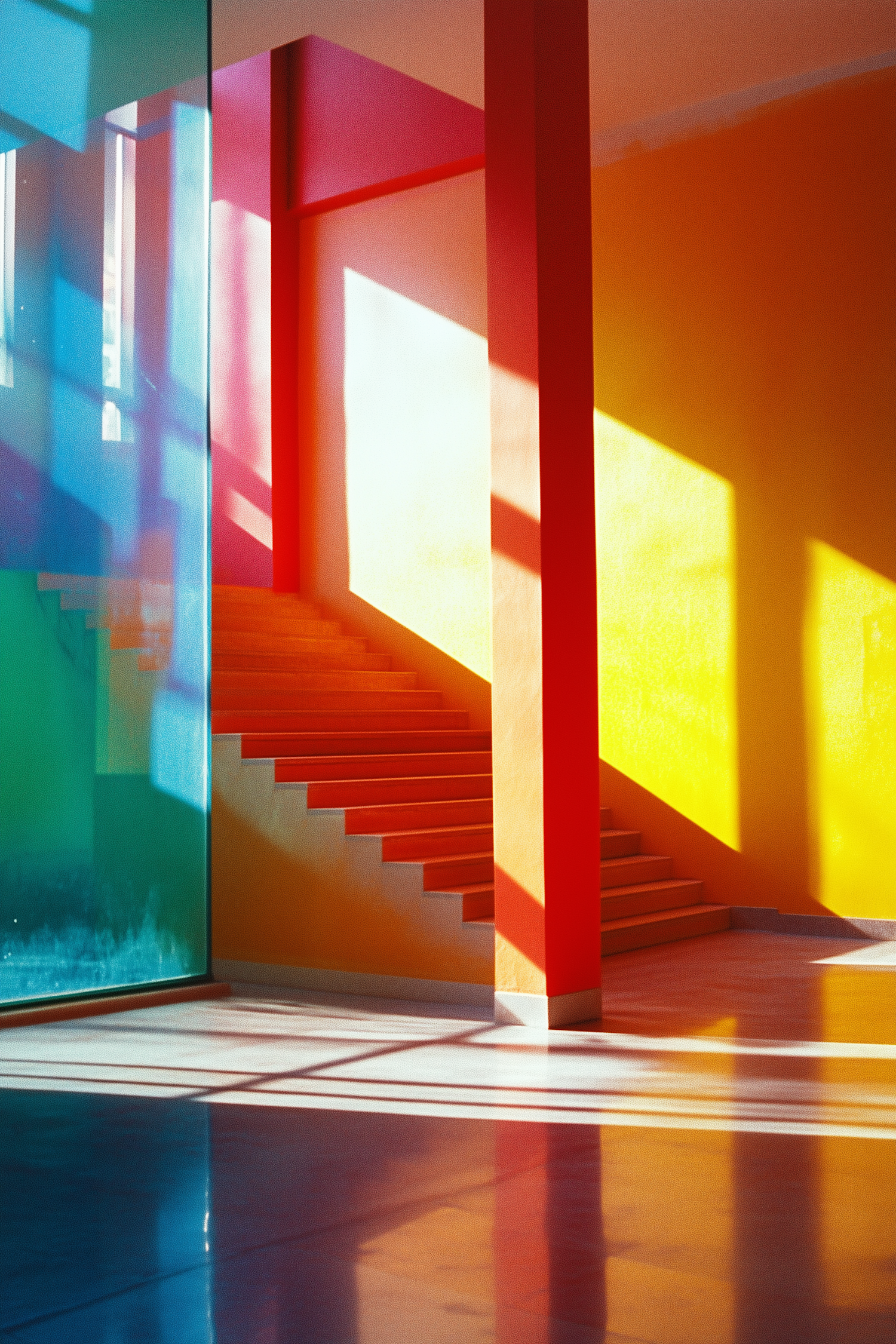 Colorful interior with red stairs, yellow and red walls, and blue-green glass reflections creating vibrant light patterns.