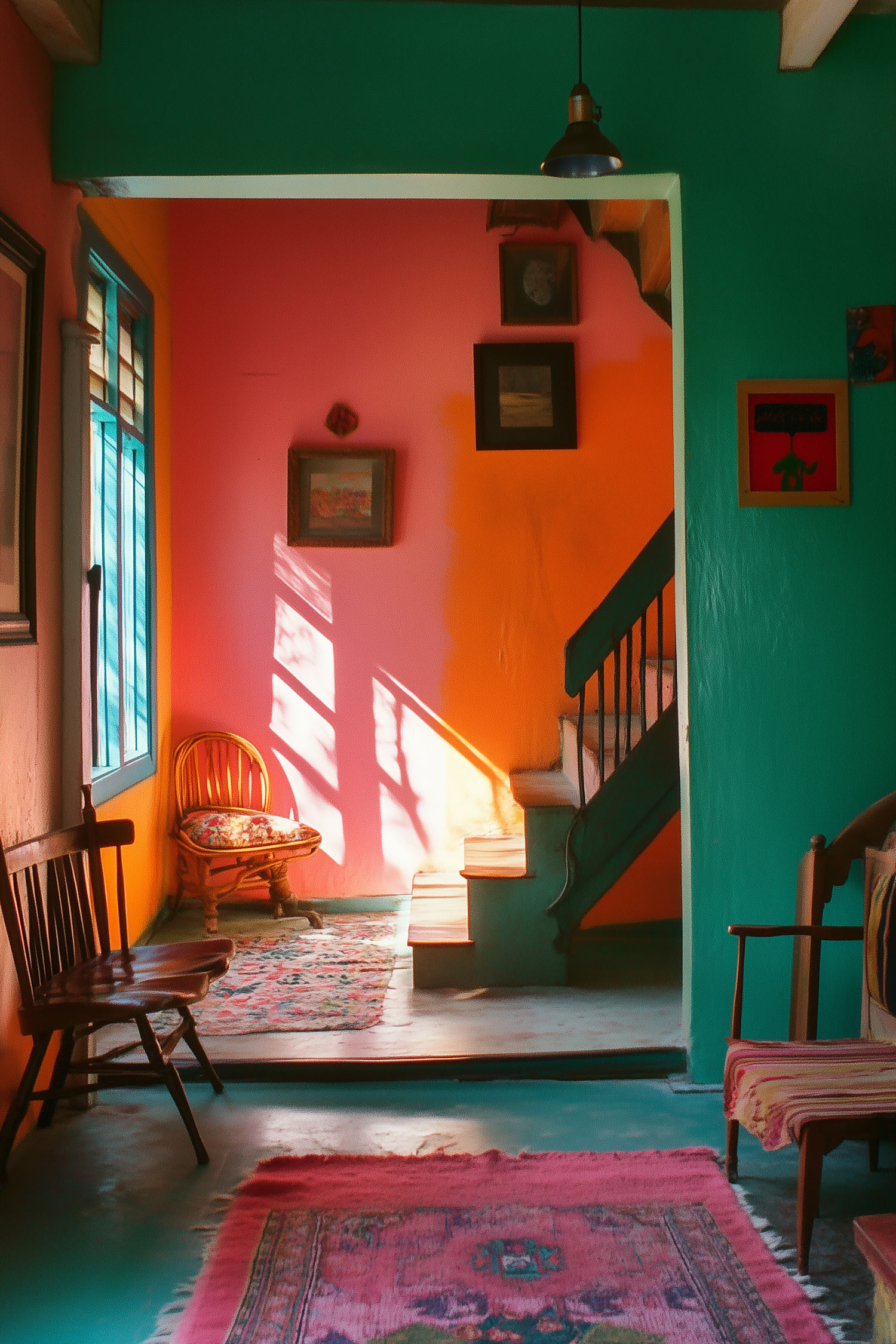 Colorful interior with pink, orange, and teal walls, sunlight, wooden chairs, and eclectic decor creating a vibrant atmosphere.