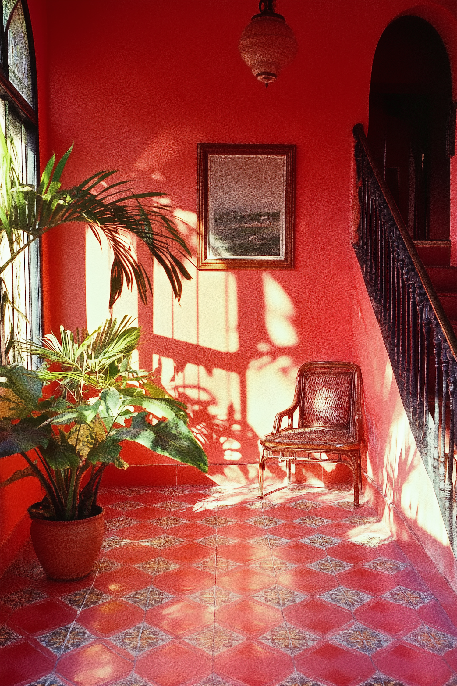 Sunlit hallway with red walls, a wicker chair, potted plant, and geometric tiled floor. Warm and inviting interior design.