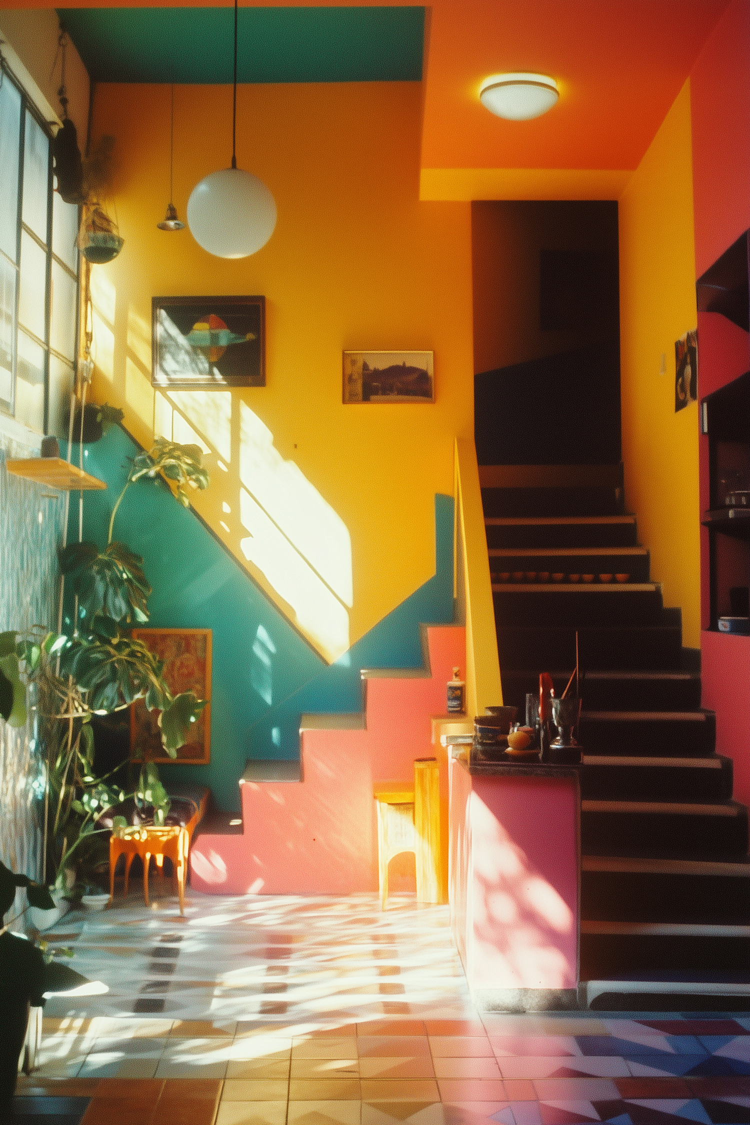 Colorful interior with bold walls, geometric shadows, and eclectic decor. Sunlit space with teal, pink, and yellow accents.