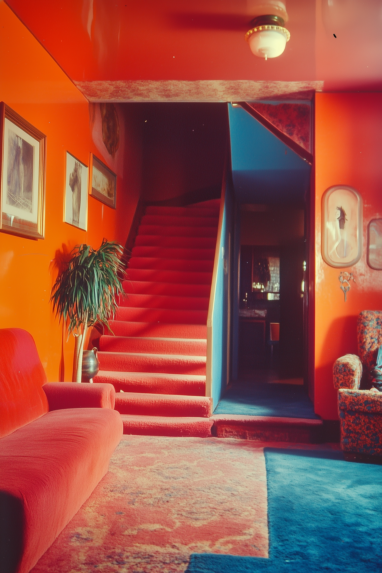 Vibrant interior with red carpeted stairs, orange walls, and eclectic decor. Features a red sofa, artwork, and a vintage ceiling lamp.