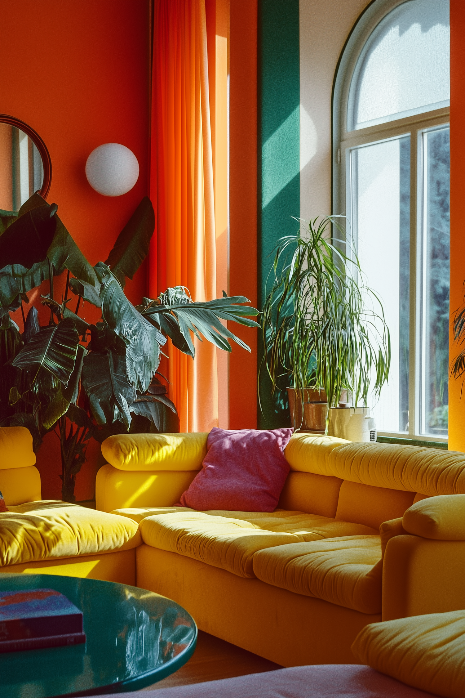 Bright living room with yellow sofa, orange walls, lush plants, and arched windows, creating a vibrant and tropical ambiance.