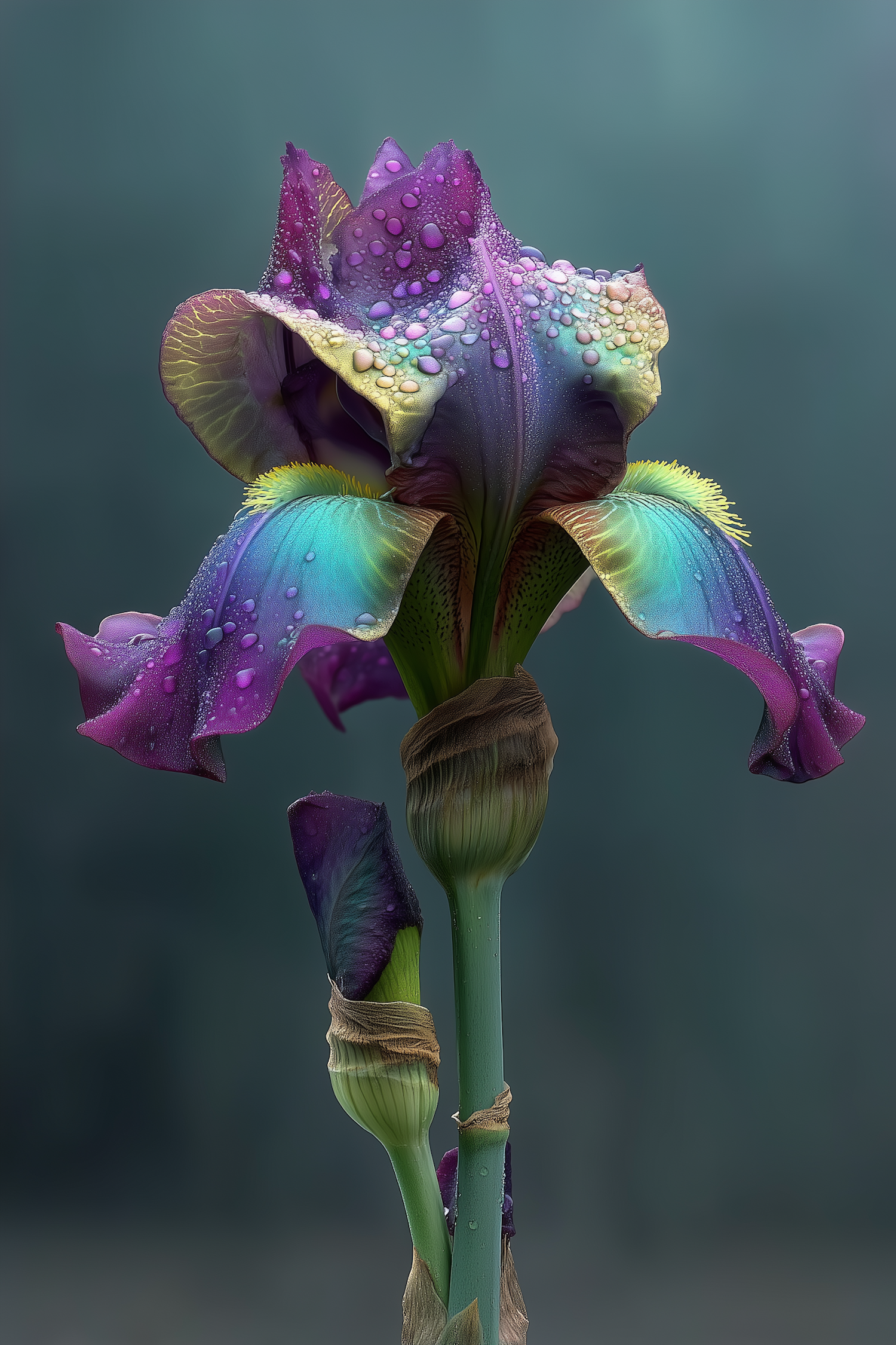 A stunning close-up of a colorful iris flower with water droplets on its petals, set against a soft teal background.