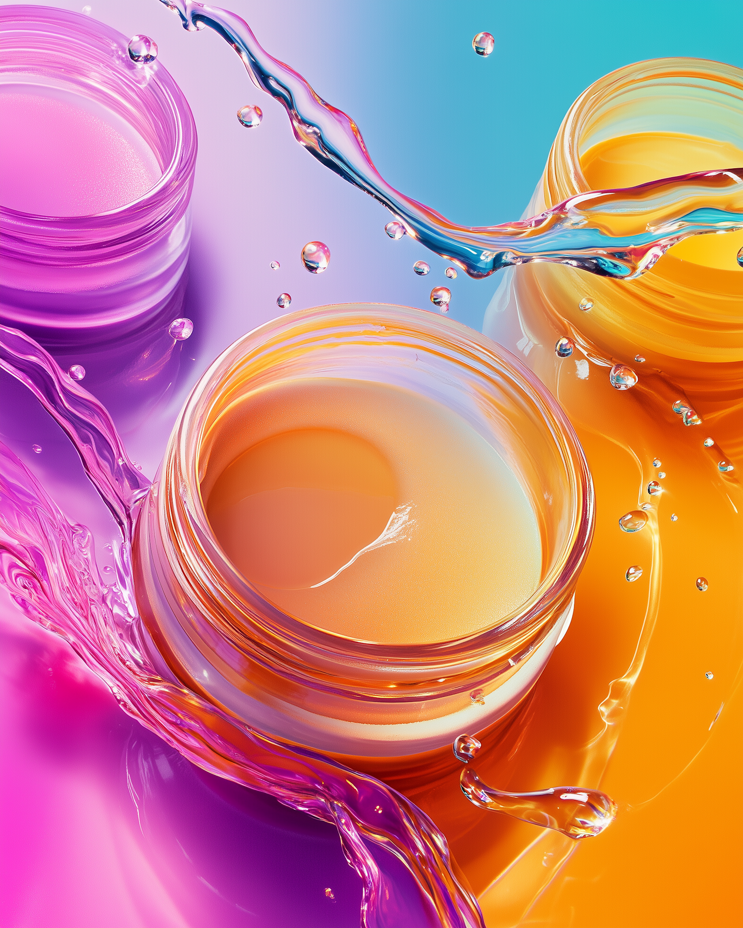 Colorful jars of cream with dynamic liquid splashes on a vibrant gradient background, creating a lively and artistic scene.