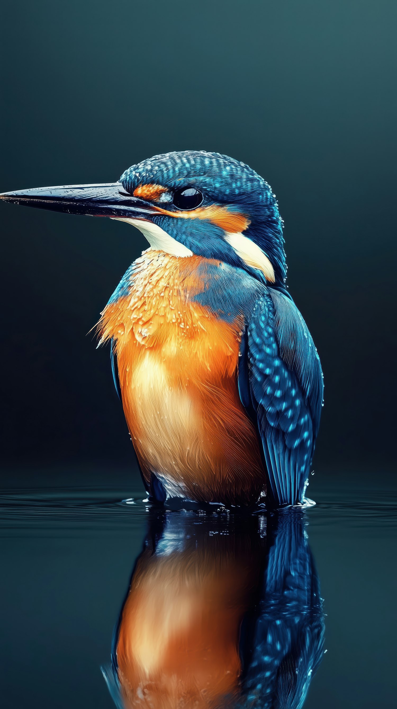 Vibrant kingfisher with striking blue and orange plumage, poised at water's edge with a perfect reflection.