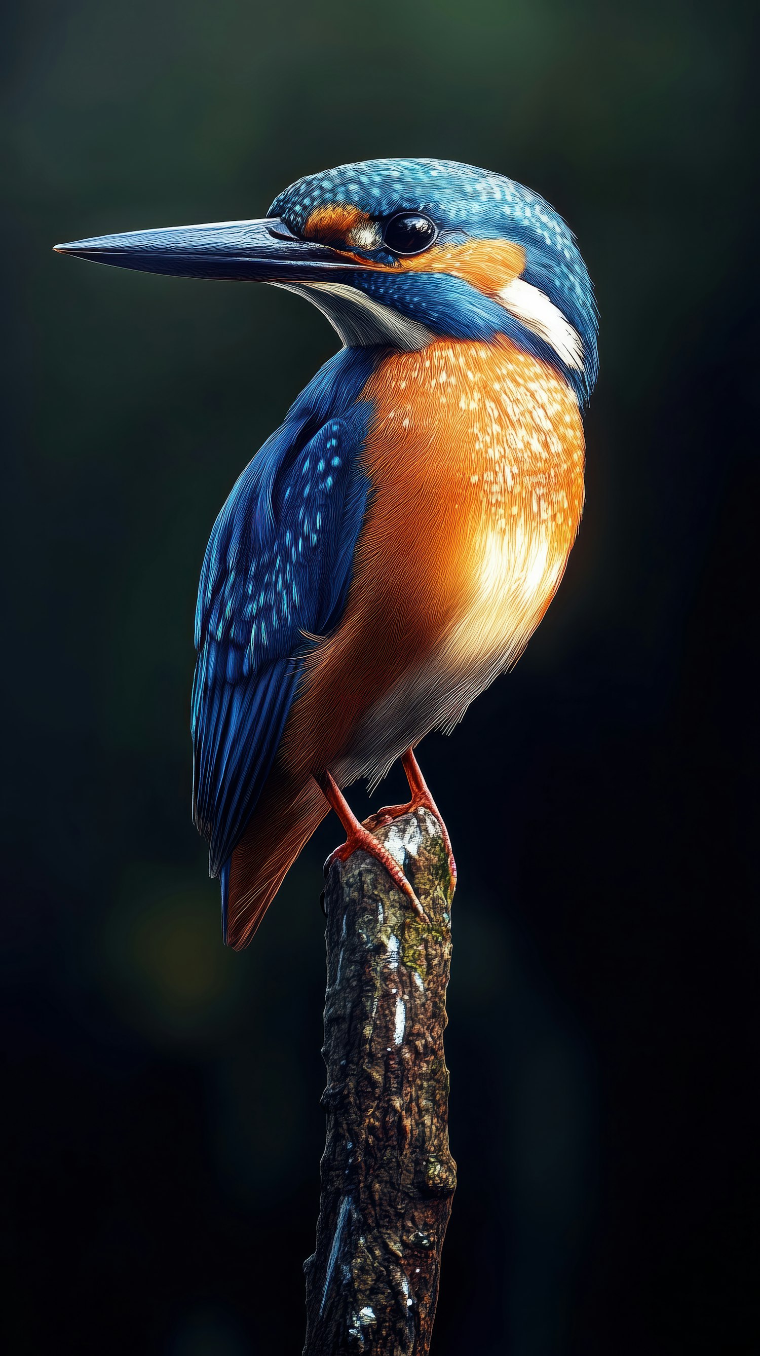 Close-up of a vibrant kingfisher bird with vivid blue and orange plumage perched on a mossy branch against a blurred green background.