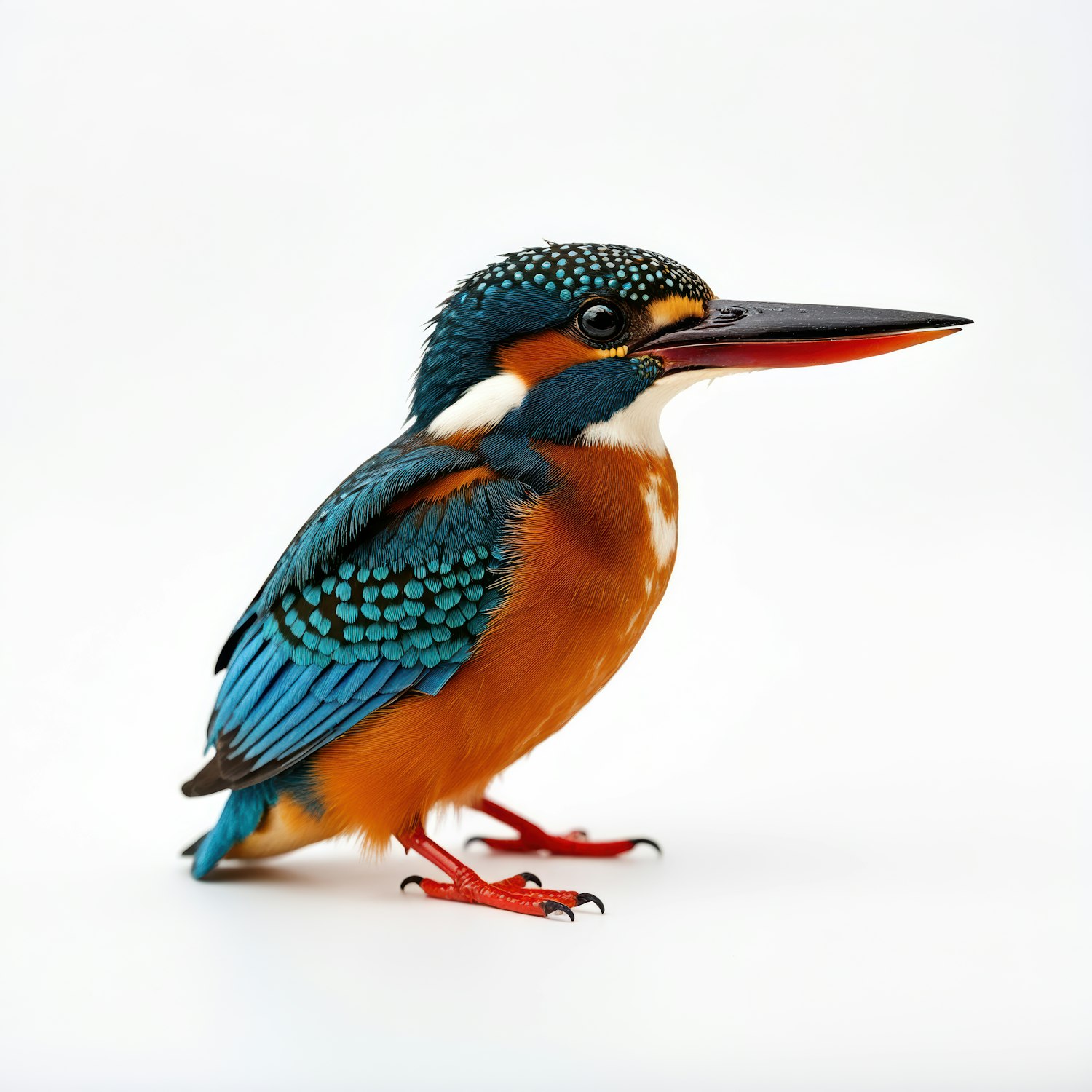 Vibrant kingfisher with electric blue and orange plumage, sharp black beak, and red feet against a plain white background.