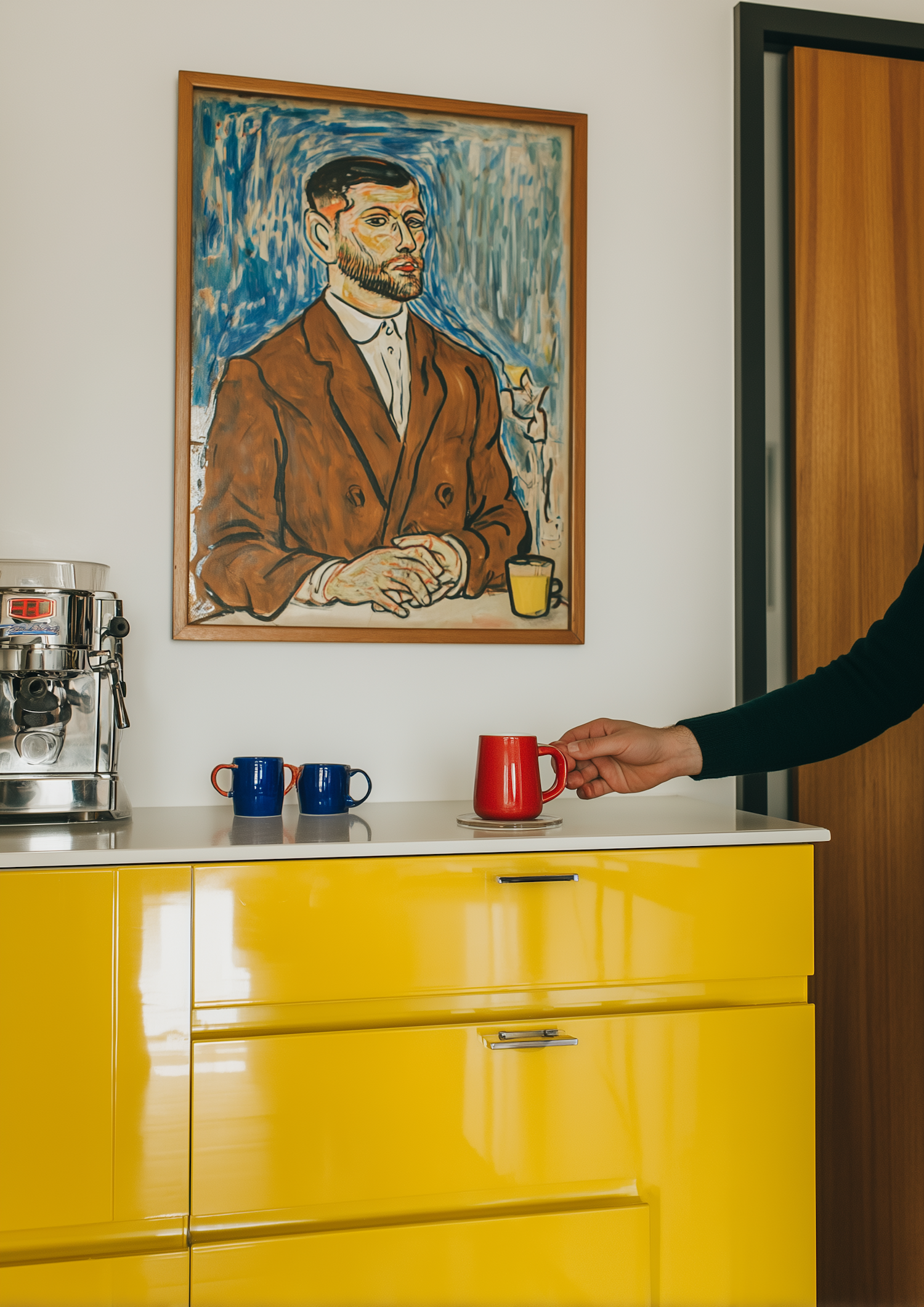 A bright kitchen with a yellow cabinet, espresso machine, colorful mugs, and a framed painting, creating a lively and artistic atmosphere.