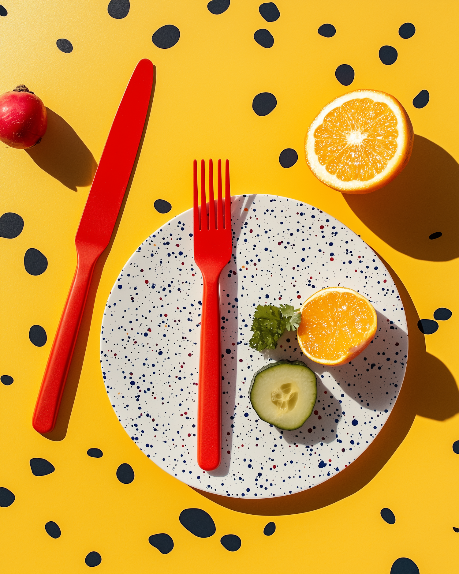Bright flat-lay with a speckled plate, red cutlery, cucumber, orange, and radish on a yellow background with black shapes.