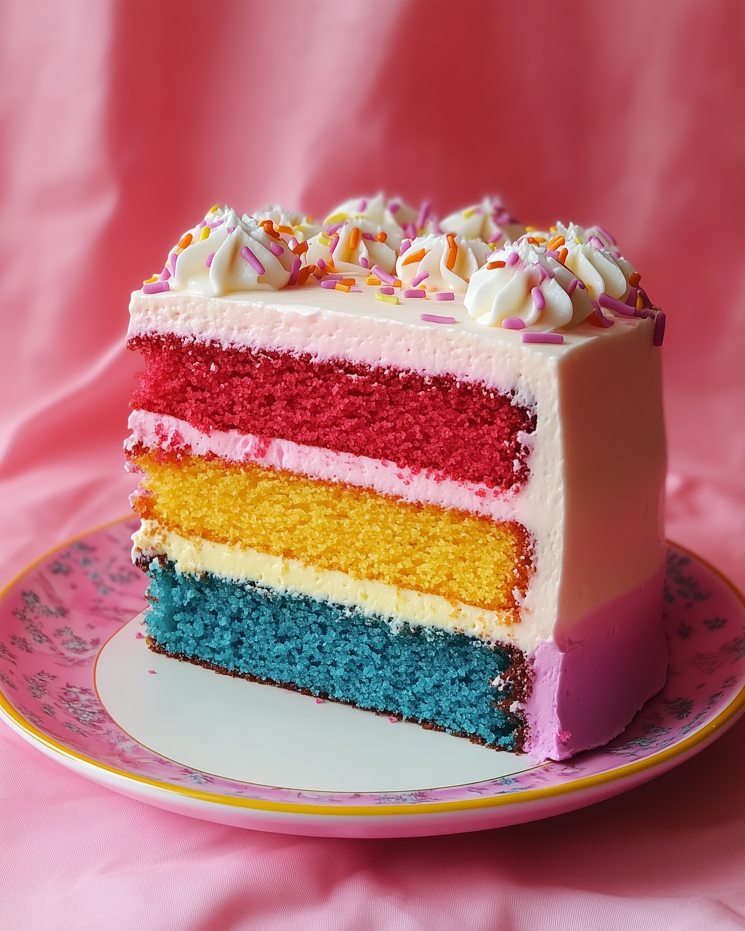 Colorful three-layer cake with red, yellow, and blue layers, topped with white frosting and sprinkles on a floral plate.