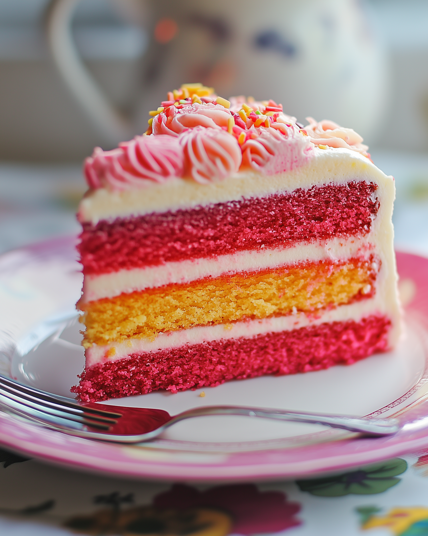 Colorful layered cake slice with pink and yellow layers, topped with pink frosting and sprinkles on a floral plate.
