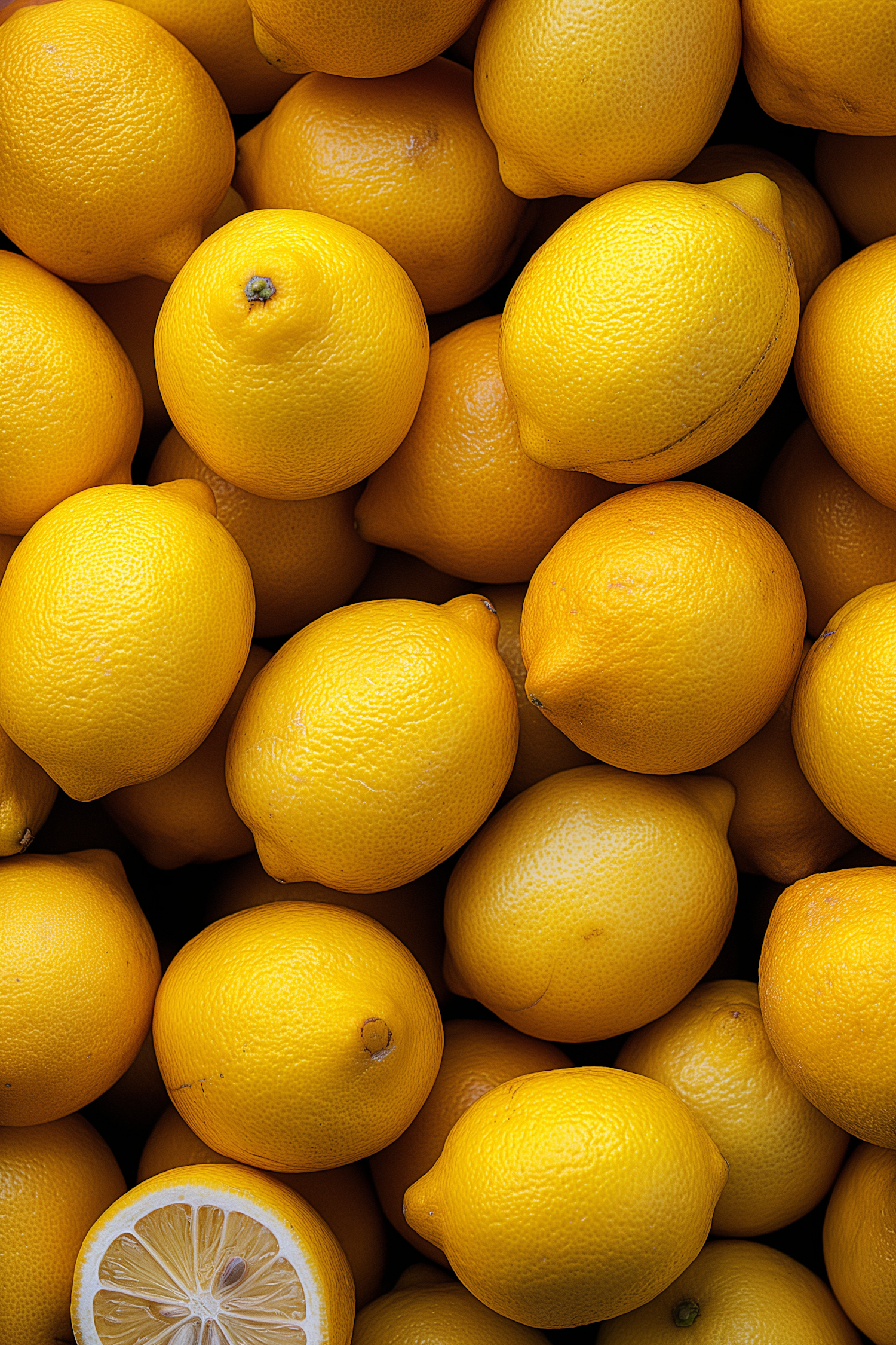 A vibrant pile of fresh lemons with one cut in half, showcasing their bright yellow color and juicy texture.