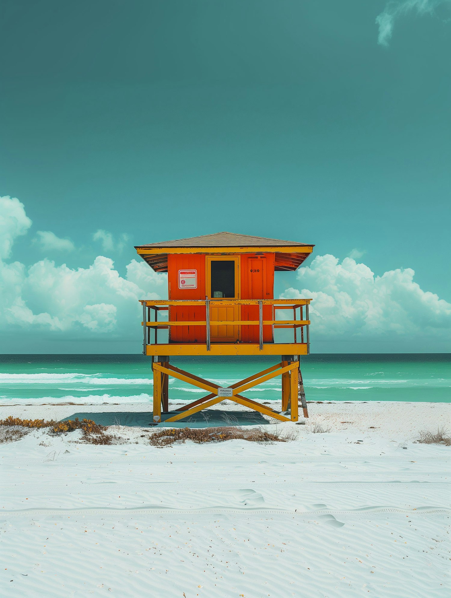 Vibrant orange lifeguard tower on a white sandy beach with turquoise sky and ocean. Fluffy clouds add depth to the serene scene.