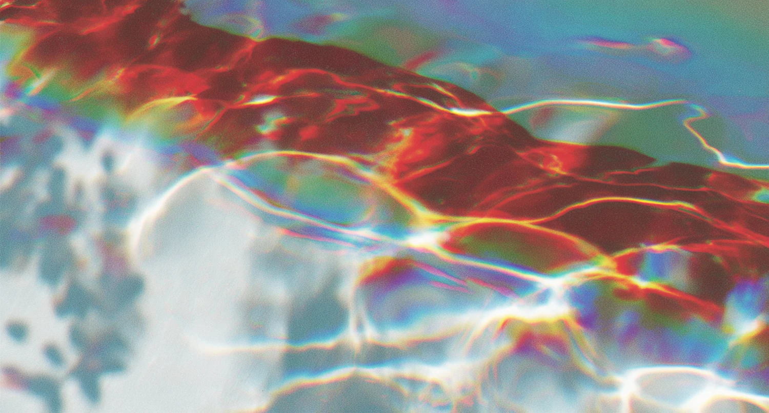 Abstract art with vibrant red, blue, and green hues blending in a fluid, dynamic pattern, resembling light refraction or rippling water.
