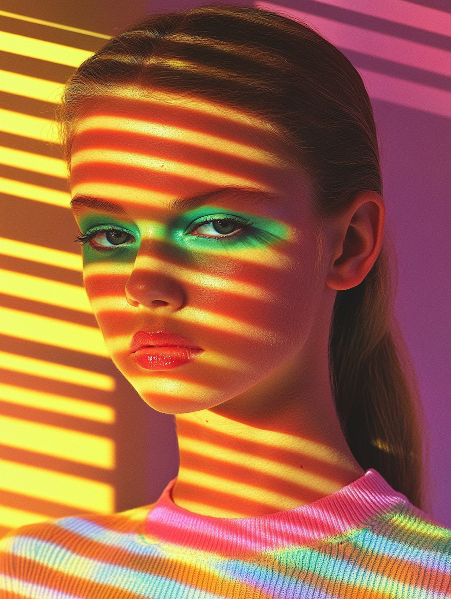 A young woman with colorful striped light on her face, creating a vibrant and artistic visual effect.