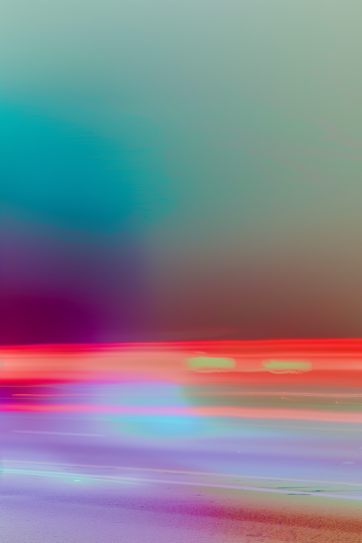Abstract light trails in vibrant red, pink, and purple hues against a teal-to-beige gradient background, evoking motion and energy.