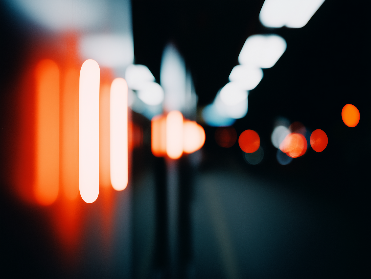 Abstract blurred lights with glowing orange streaks and bokeh circles in a dark, moody setting. Perfect for a modern, atmospheric vibe.