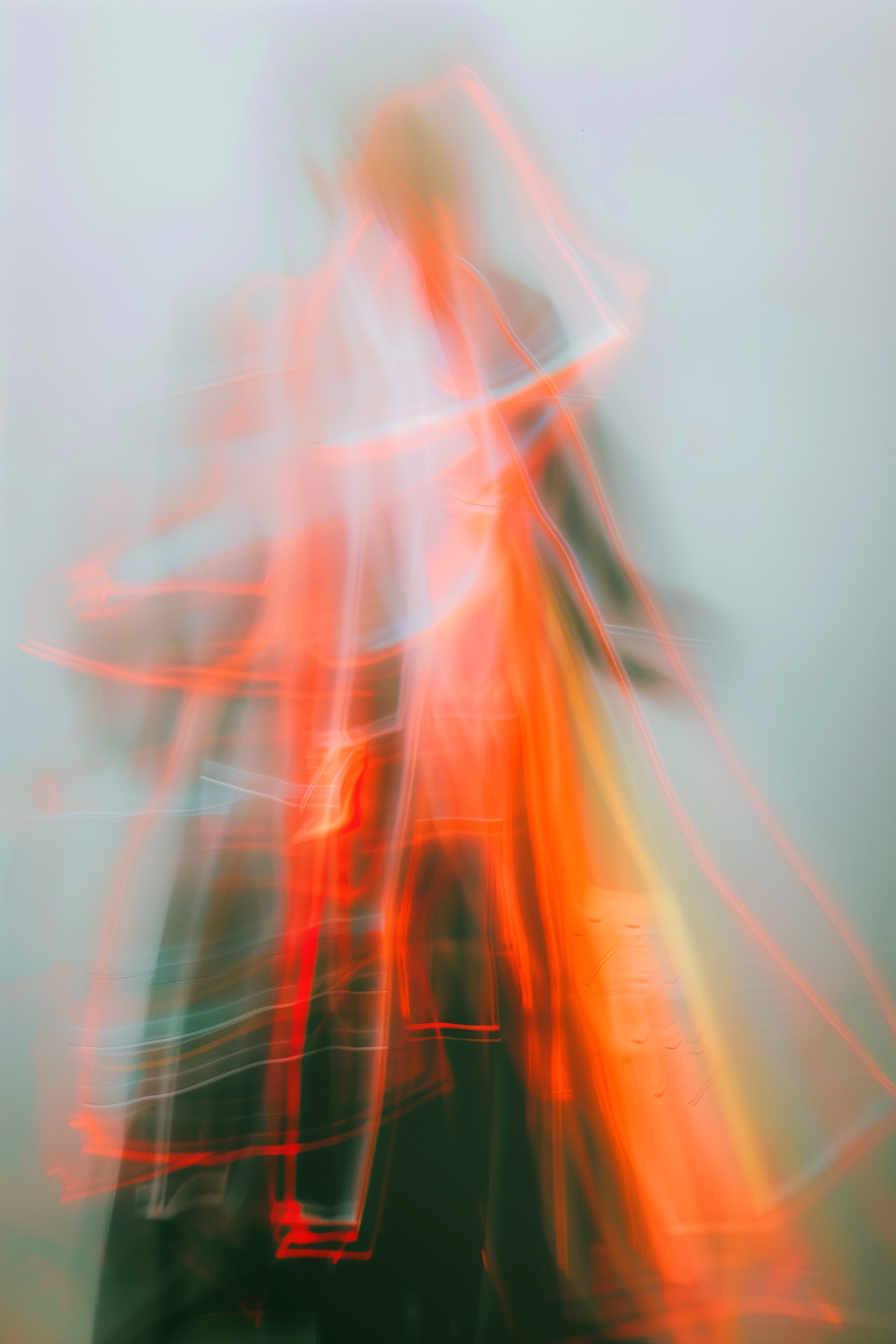 Abstract light trails in orange and red on a muted green background, creating a dynamic and energetic visual effect.