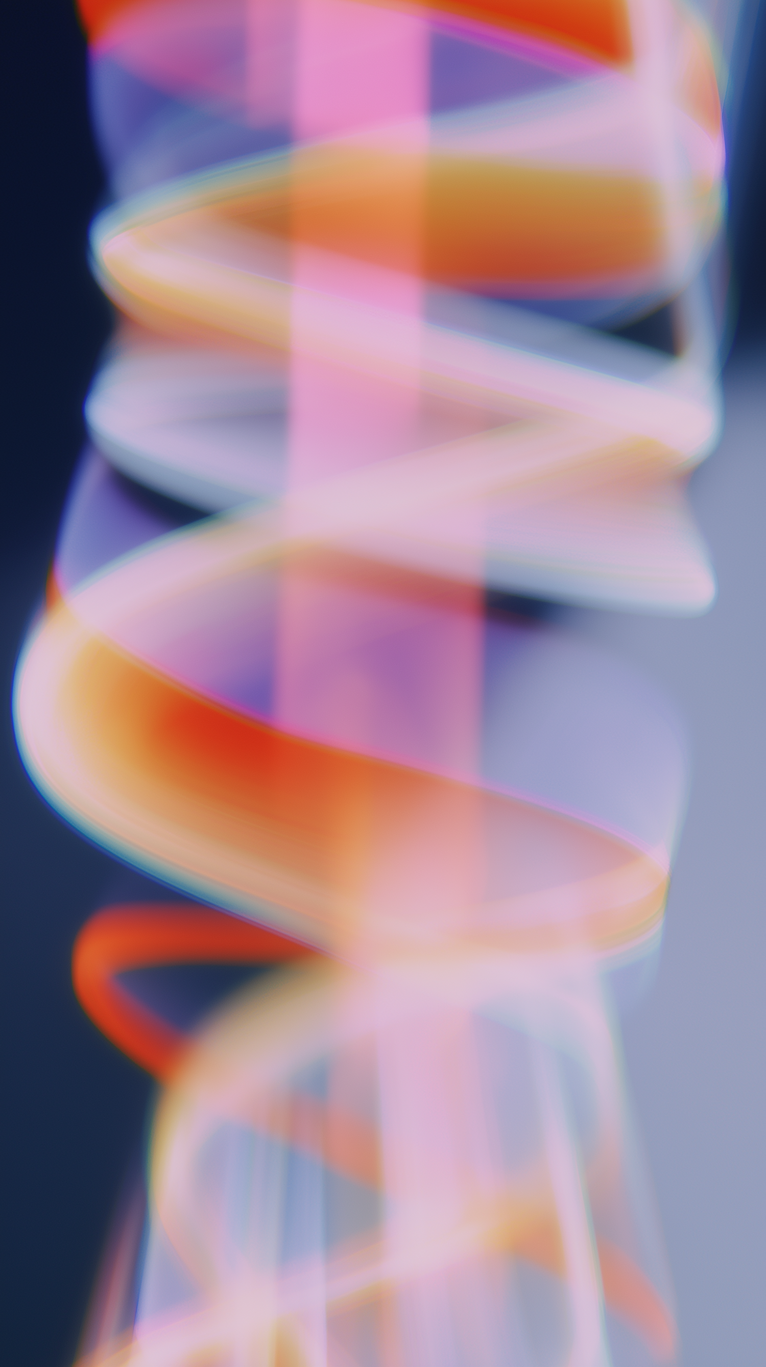 Abstract light trails in pink, orange, and yellow swirl dynamically against a dark blue and gray background, creating a dreamy, vibrant effect.