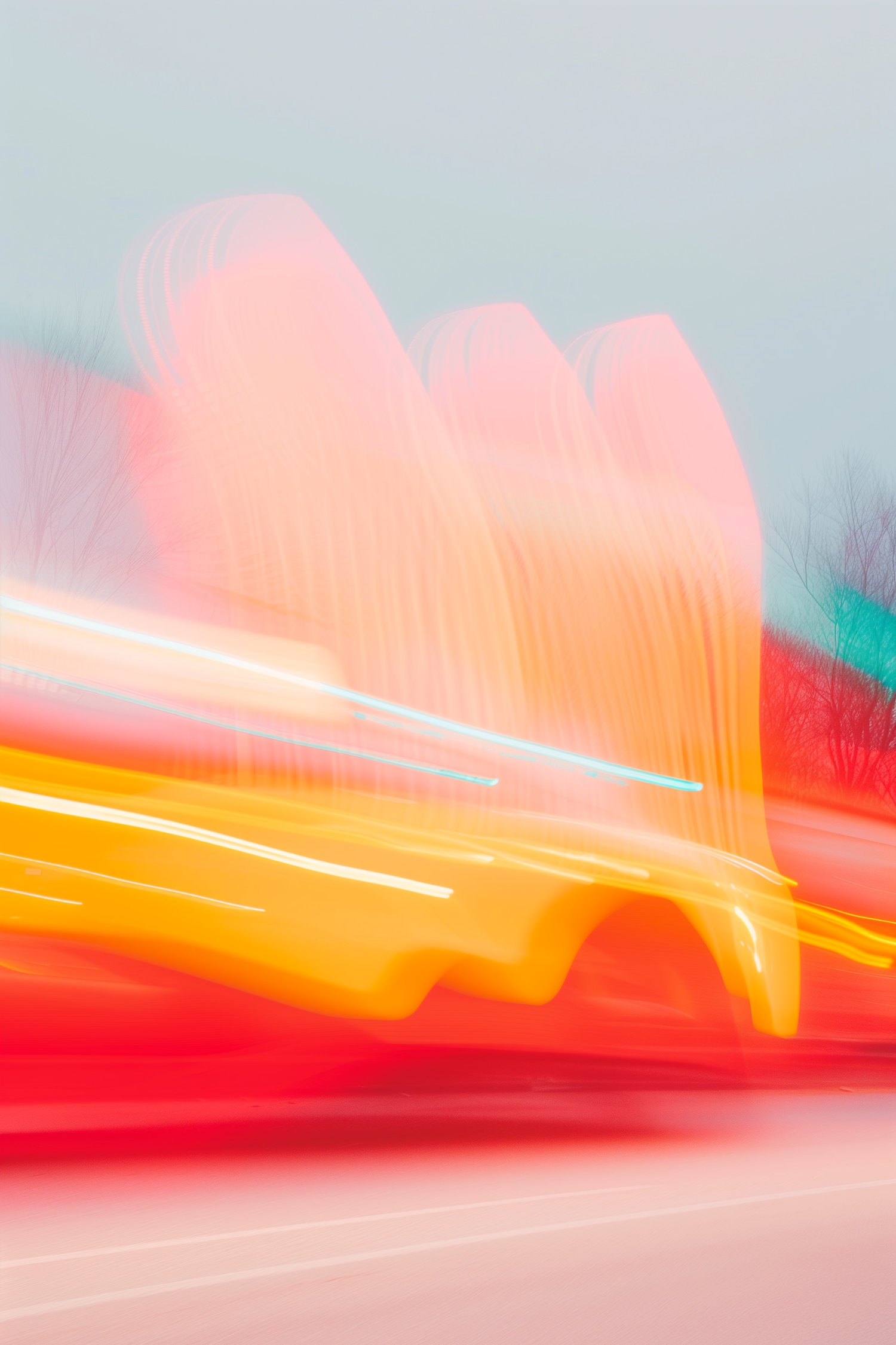 Abstract light trails in vibrant red, orange, and yellow hues with faint blue accents, set against a pale background with subtle tree outlines.