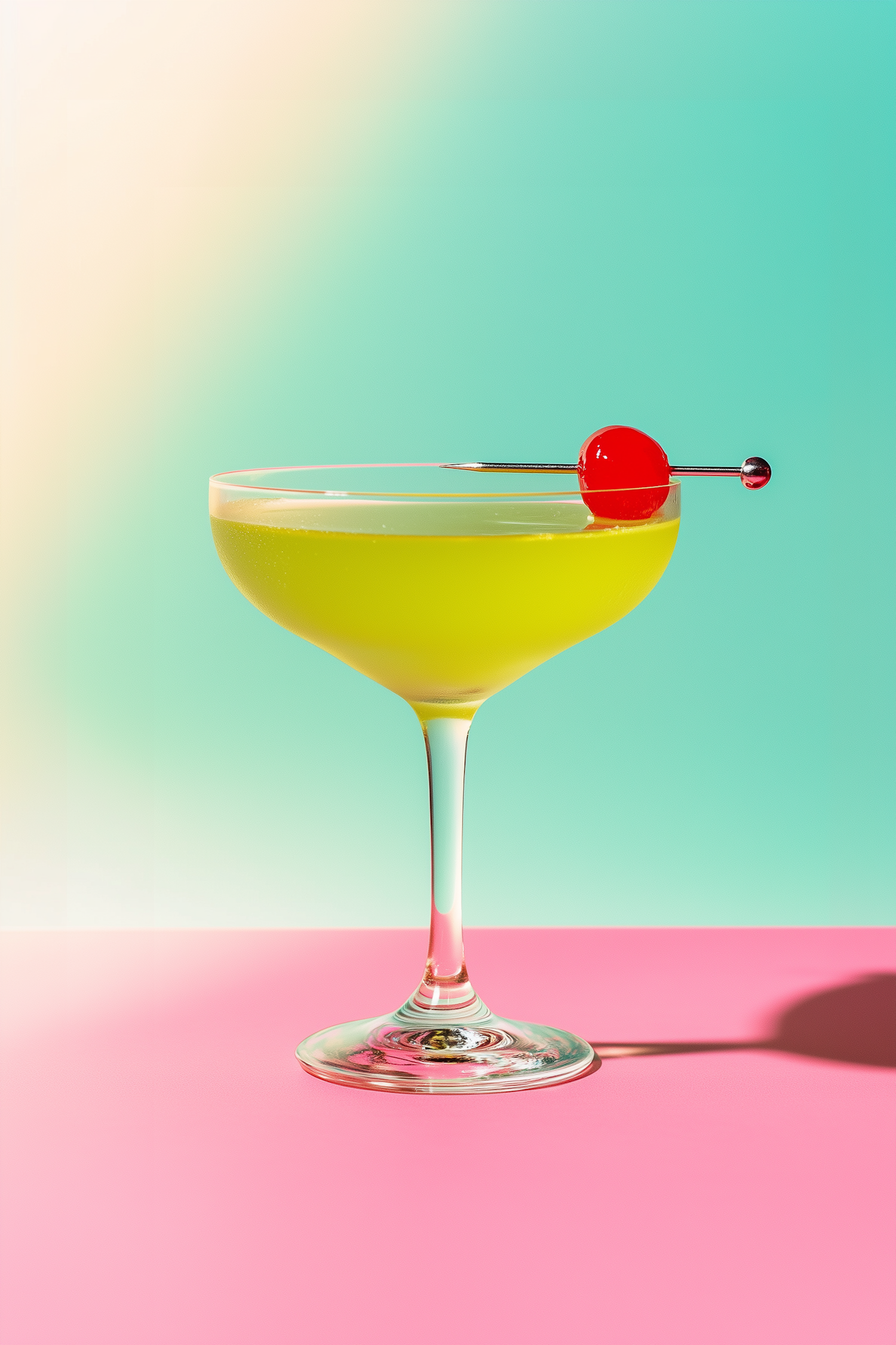 Bright lime-green cocktail in a coupe glass with a red cherry garnish, set against a pastel gradient background and pink surface.