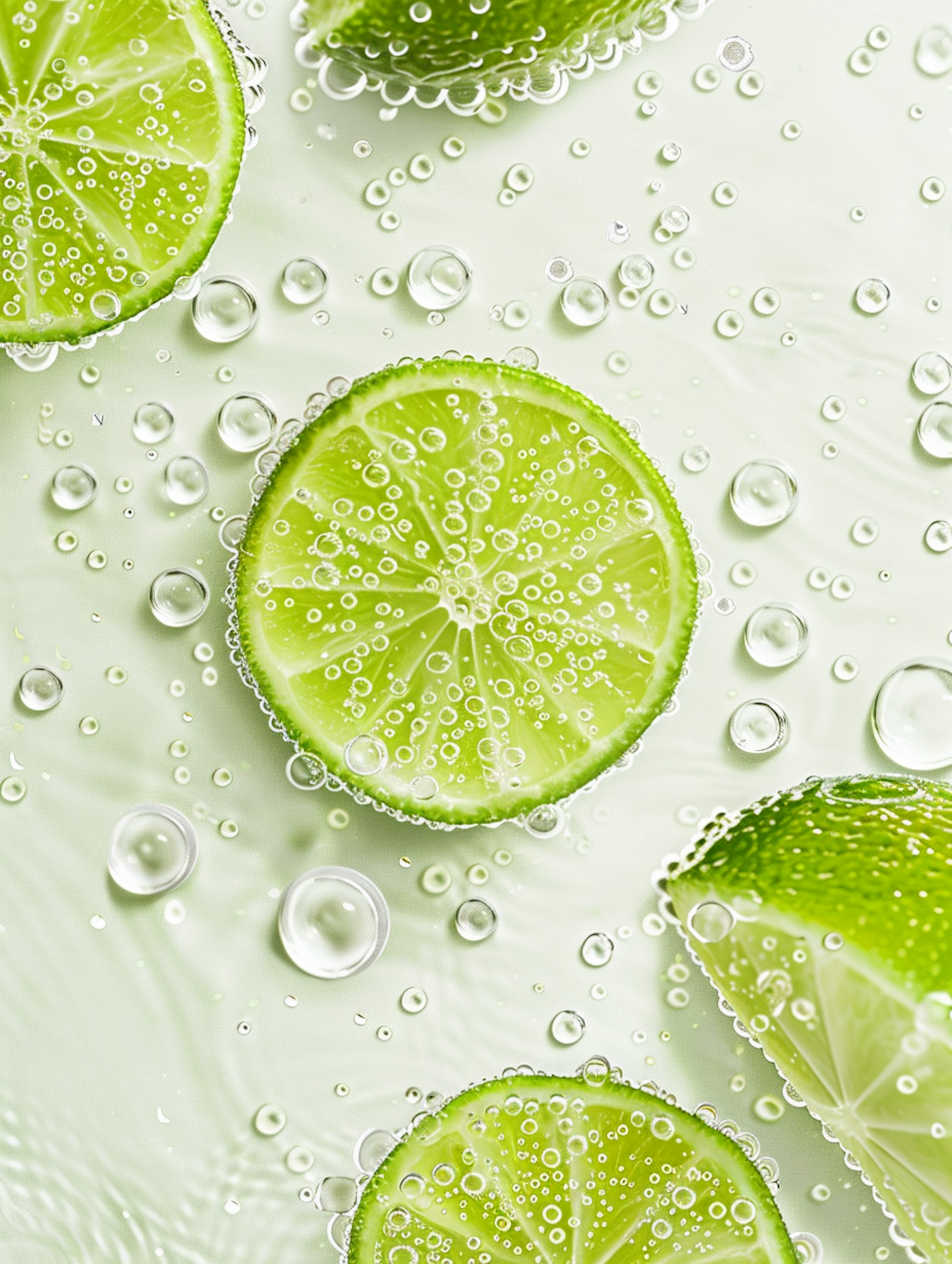 Refreshing lime slices with bubbles in a clear liquid, set against a light green background, creating a vibrant and zesty scene.