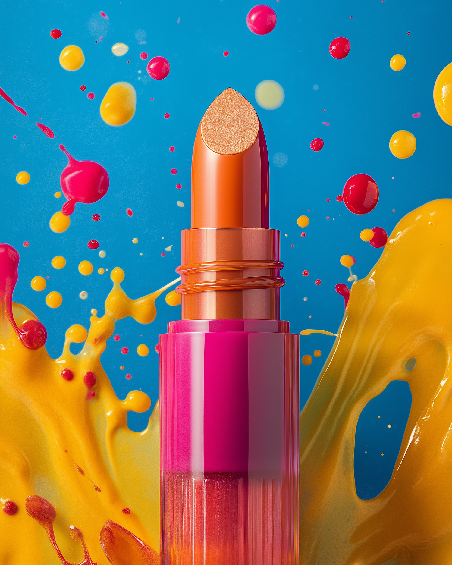 Vibrant lipstick with orange shade against a dynamic splash background in yellow, red, and blue. Eye-catching and colorful design.