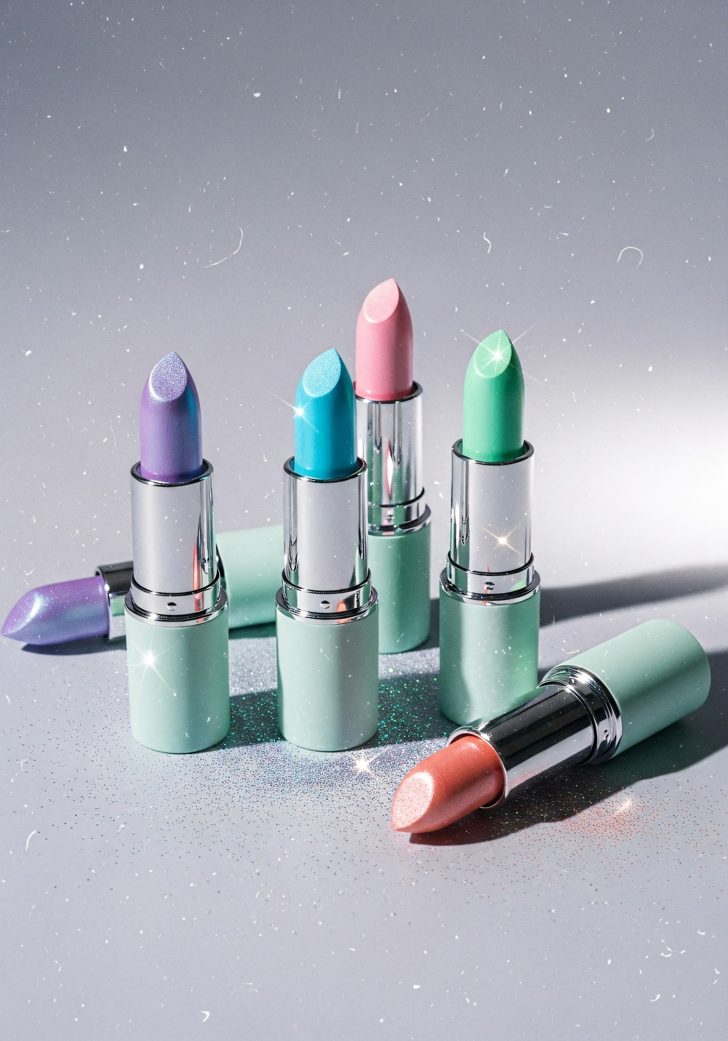 A set of pastel and glittery lipsticks in mint green cases, arranged on a reflective surface with a sparkling background.