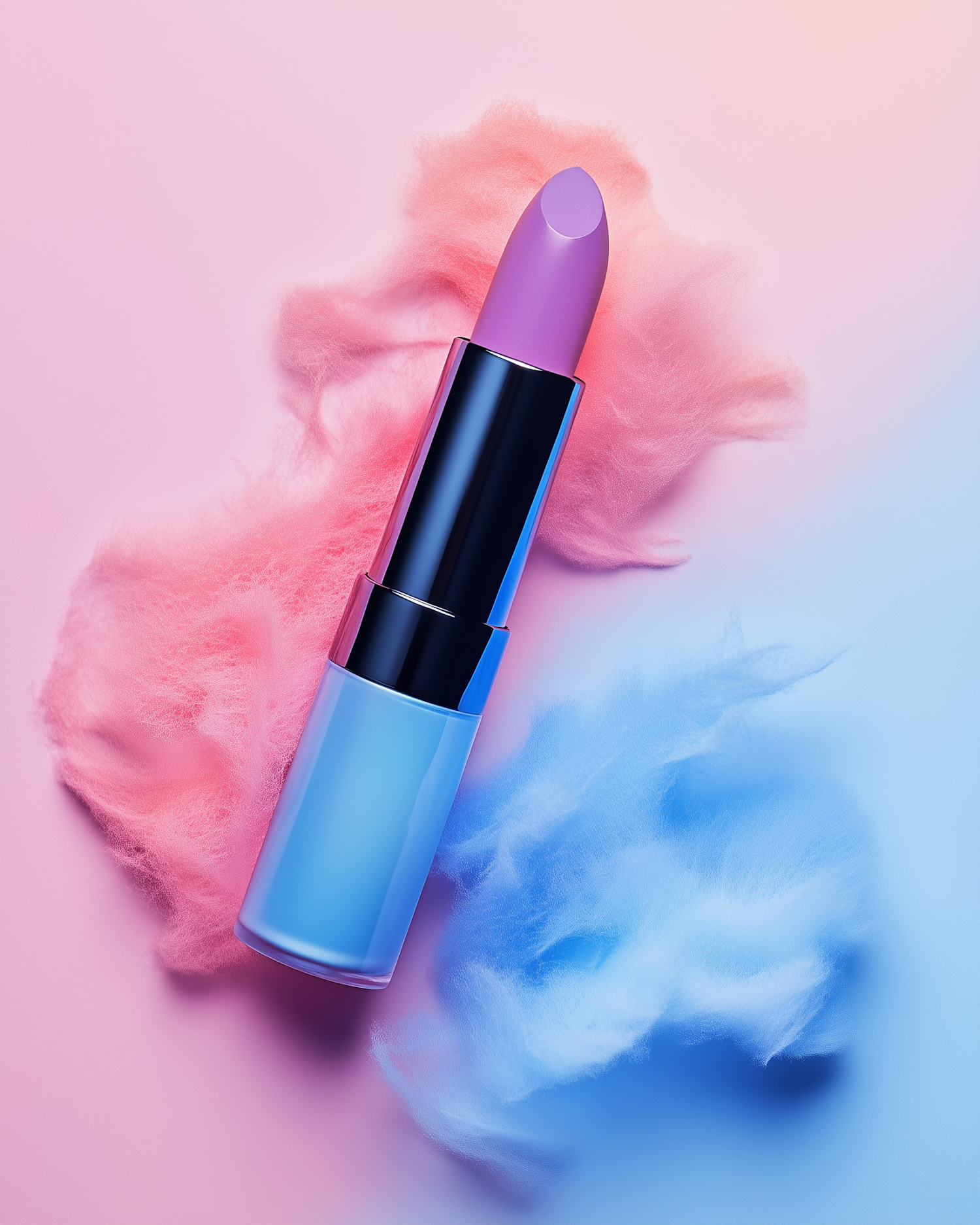 Pastel purple lipstick against a dreamy pink and blue background with fluffy textures, creating a whimsical and artistic vibe.