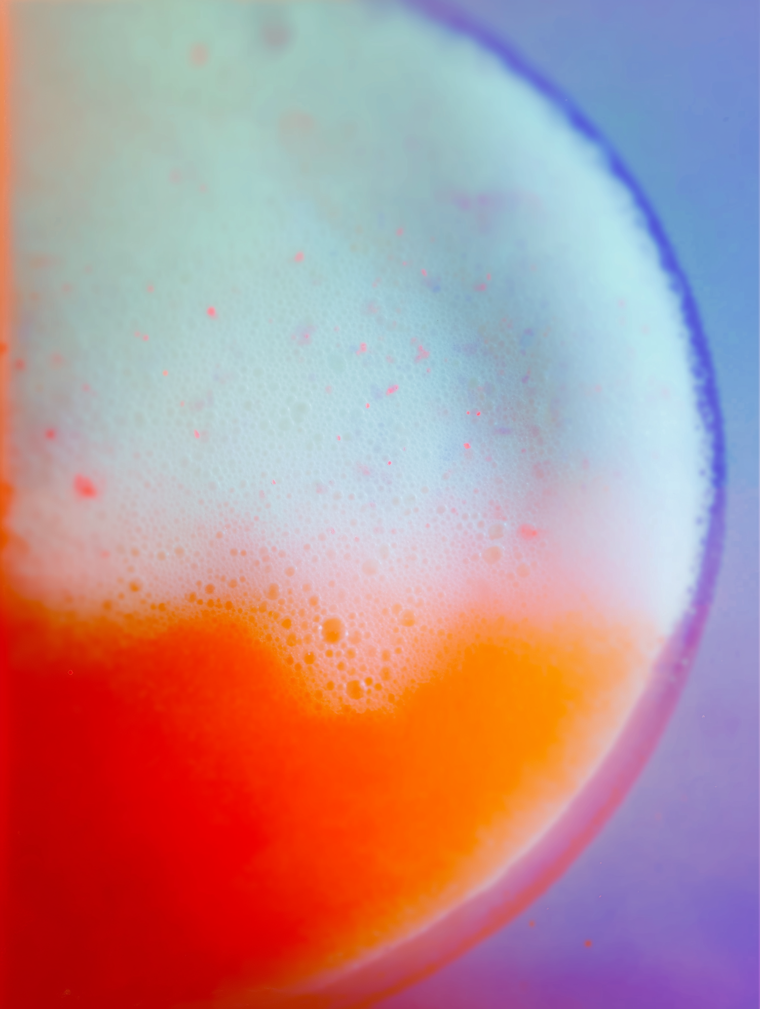 A vibrant close-up of a colorful liquid with orange and white foam, showcasing a smooth gradient and detailed texture.
