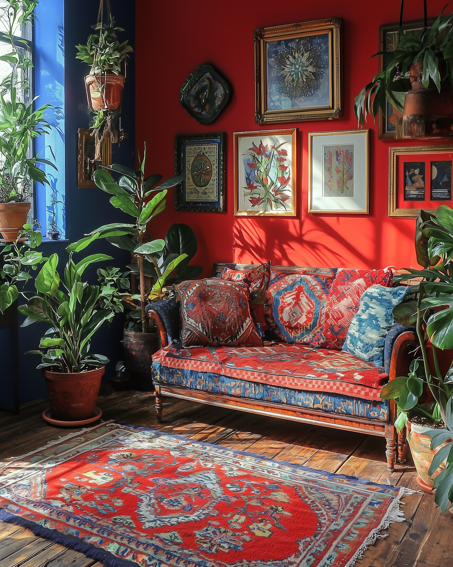 Cozy living room with red walls, vintage furniture, lush plants, and eclectic artwork. A vibrant mix of colors and textures fills the space.