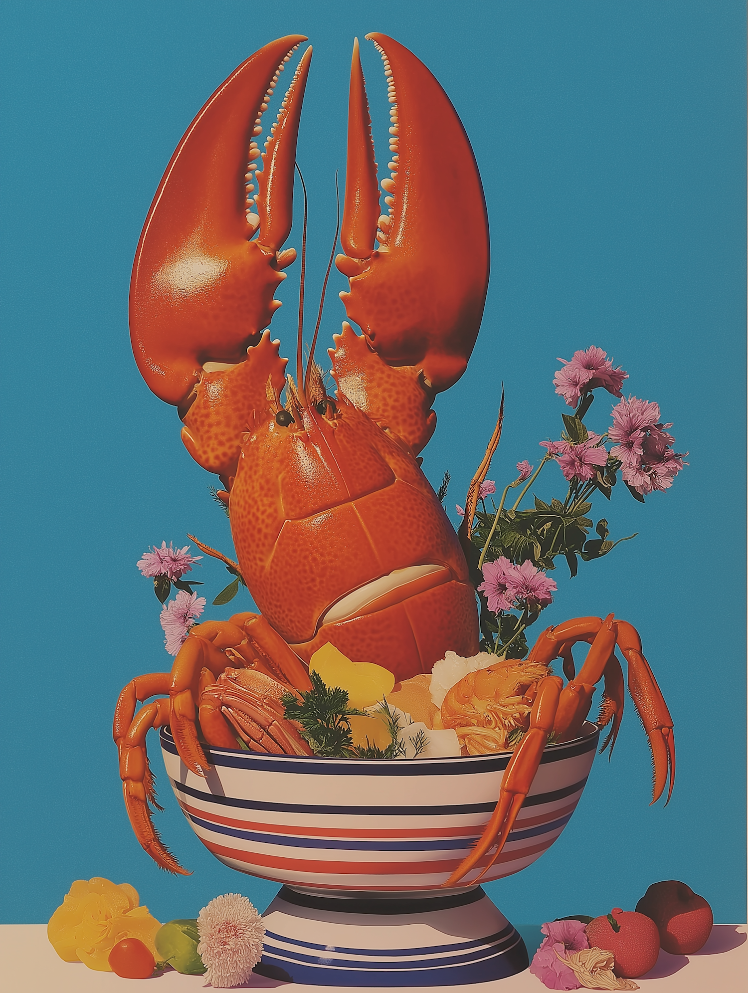A vibrant display of a lobster in a decorative bowl with flowers and herbs against a vivid blue background.