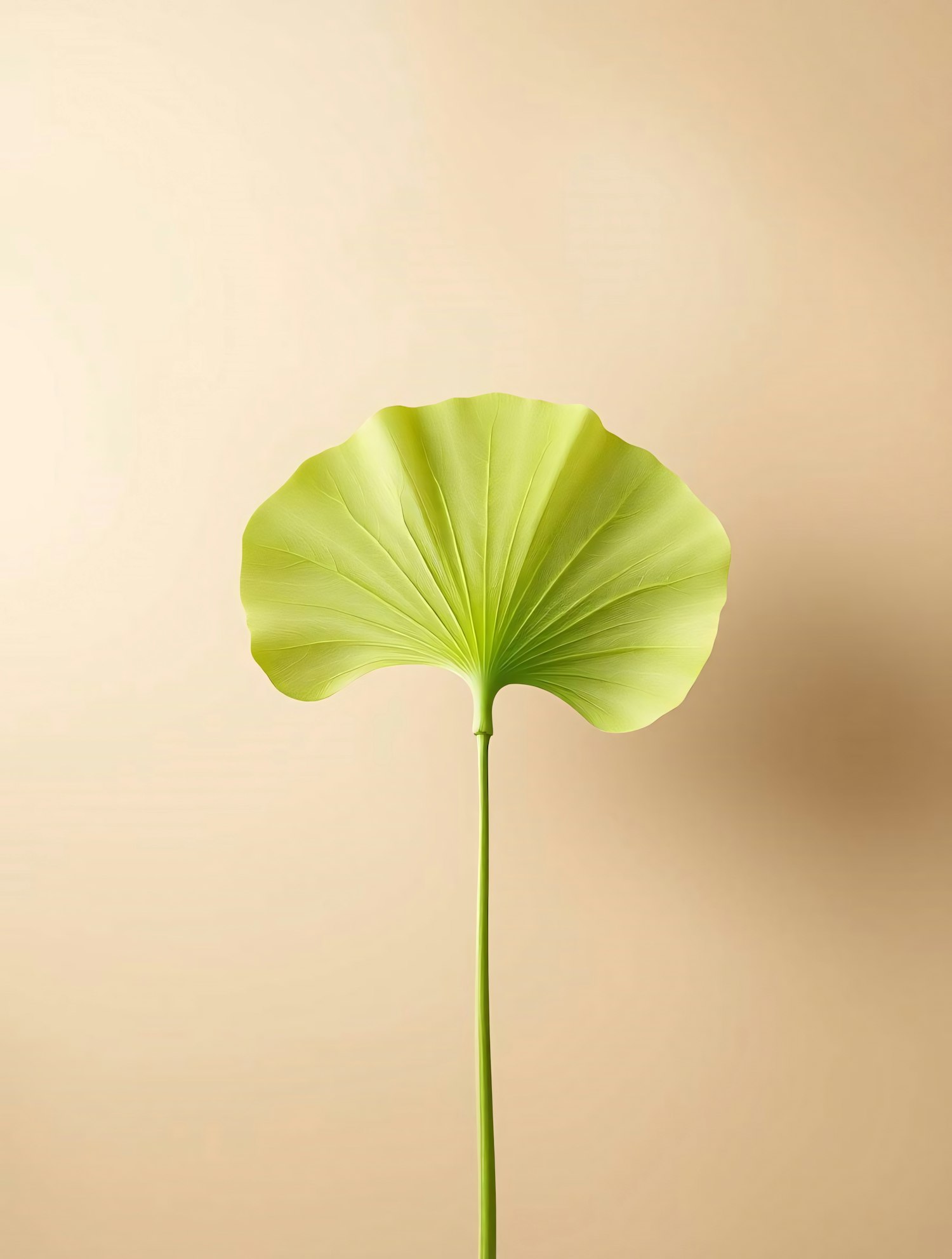 Minimalist image of a single green lotus leaf with a long stem against a soft beige background, perfect for nature-inspired designs.