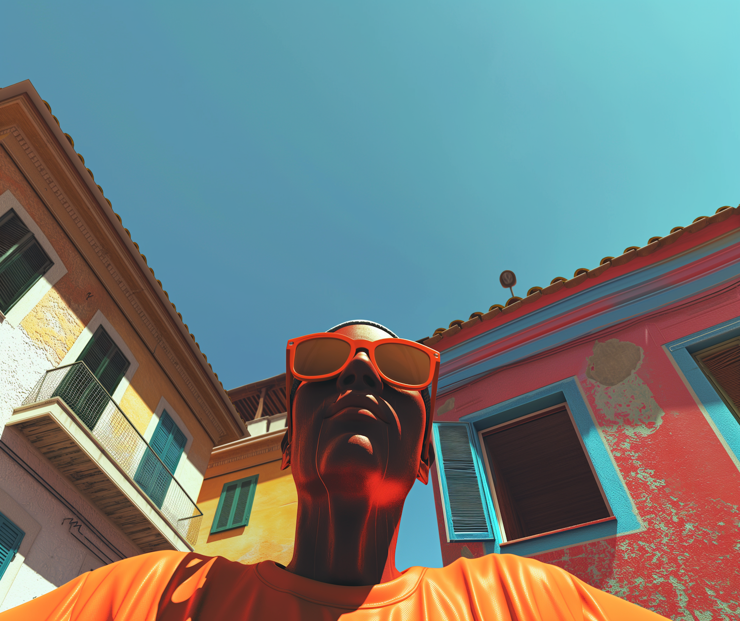 Vibrant scene with a person in orange sunglasses against colorful buildings and a clear blue sky, viewed from a low angle.