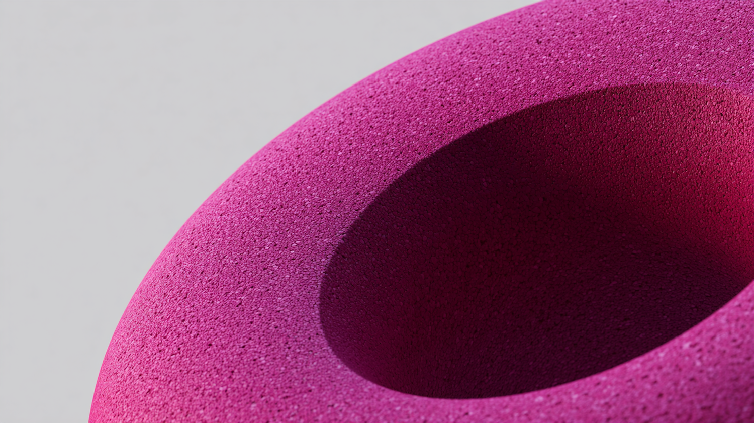 Close-up of a textured magenta object with a hollow center, showcasing its porous surface and vibrant color against a neutral background.