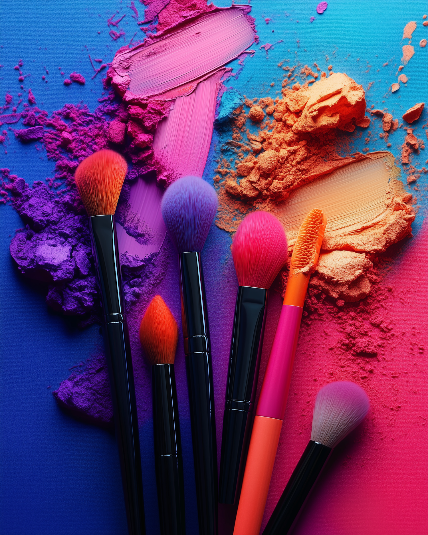 Vibrant makeup brushes and powders on a gradient background, showcasing colorful bristles and vivid hues of purple, pink, and orange.